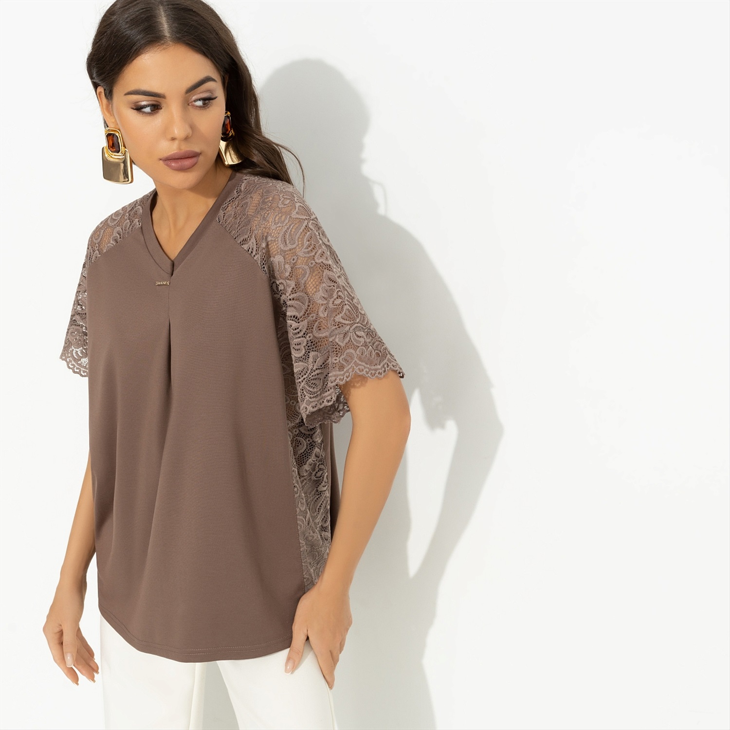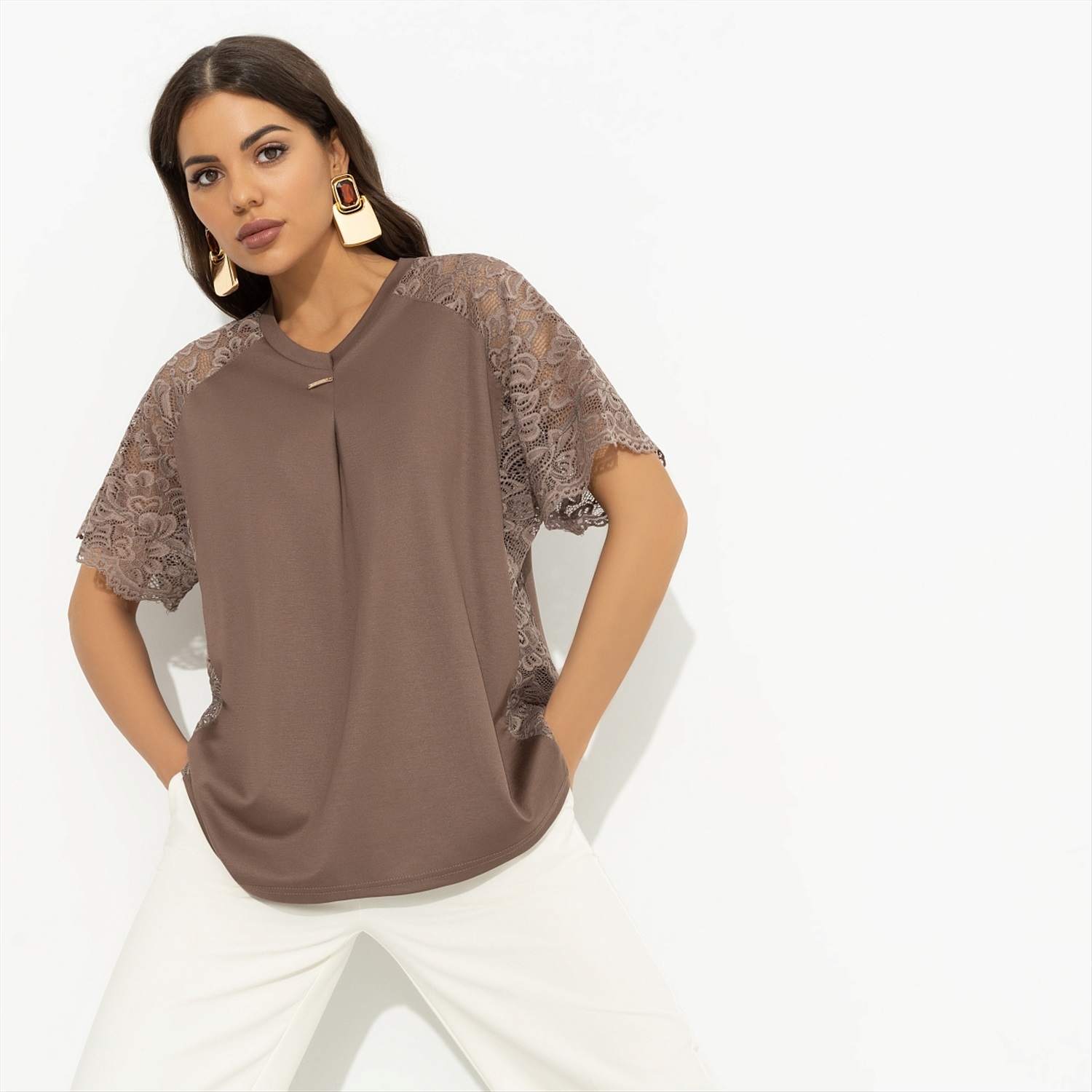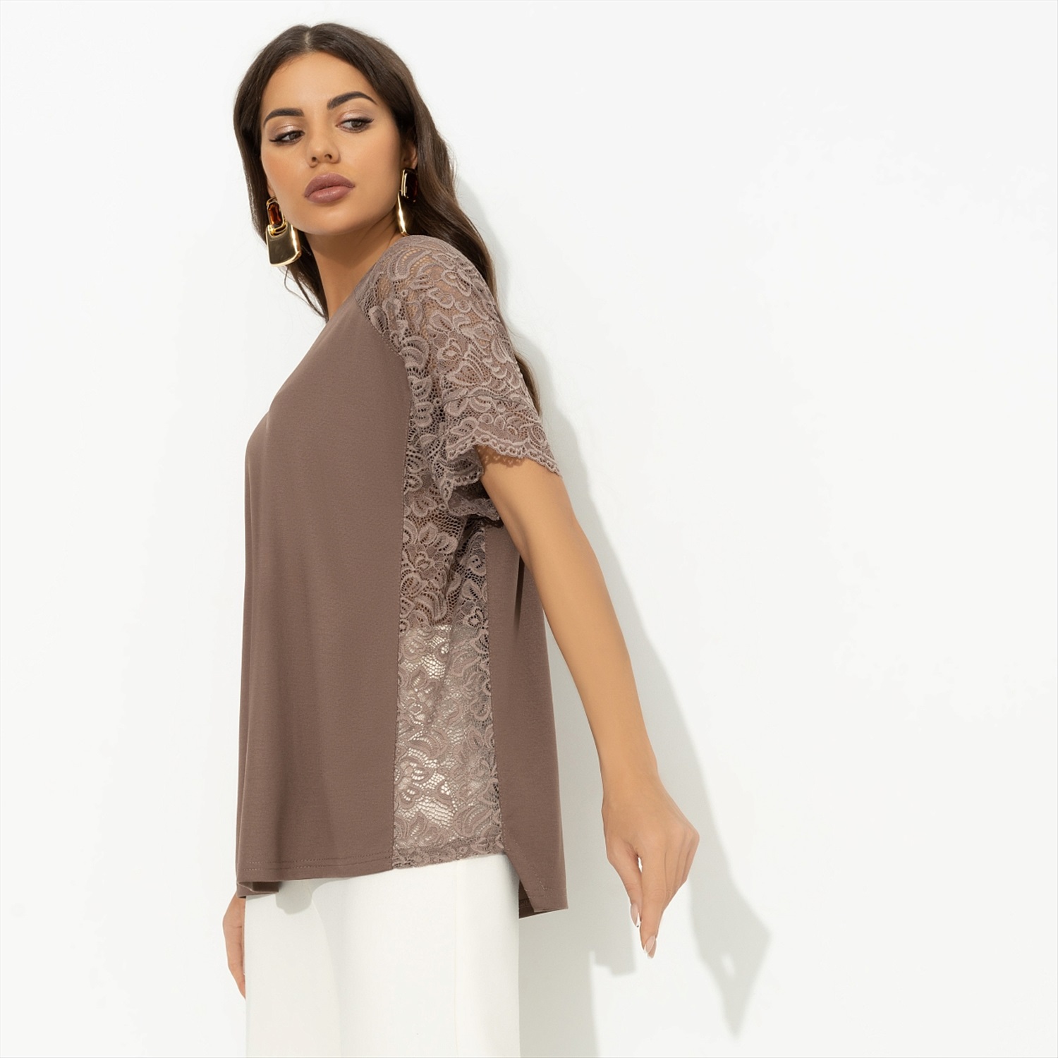 «Look of the day» – так ты подпишешь фотографию в социальной сети, спровоцировав шквал вопросов о том, откуда эта шикарная футболка. Пару минут подумав, ты решила не жадничать и поправила подпись на «Look of the day by CHARUTTI». Футболка свободного кроя. Рукава и боковые части изделия сделаны из кружева в тон основного материла. Декоративный деликатный защип в зоне декольте.