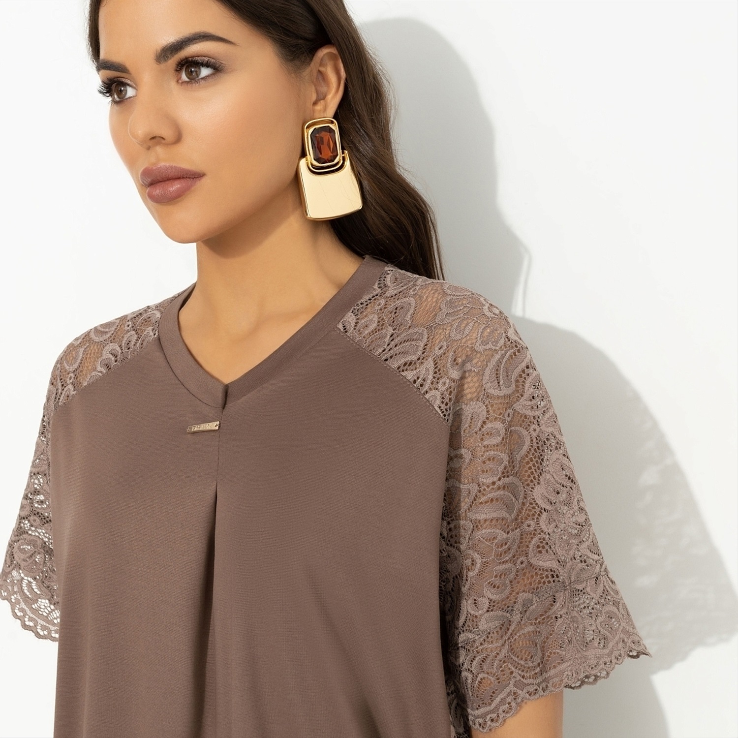 ТН ВЭД: 6109909000; Состав: Трикотаж «милано», кружево (65% полиэстер, 30% вискоза, 5% спандекс); Плотность ткани: Средняя; Тип ткани: Трикотаж; Вид застежки: Нет; Декоративные элементы: Другое; Дополнительный цвет ткани: Коричневый; Основной цвет ткани: Коричневый; Отрезная талия: Нет; Подклад: Нет; Резинка по талии: Есть; Рисунок/раппорт: Нет, все изделия идентичны; Сезон: Лето; Силуэт: Свободный; Стиль: Нарядный