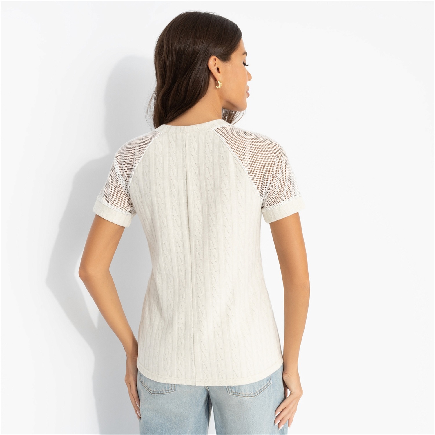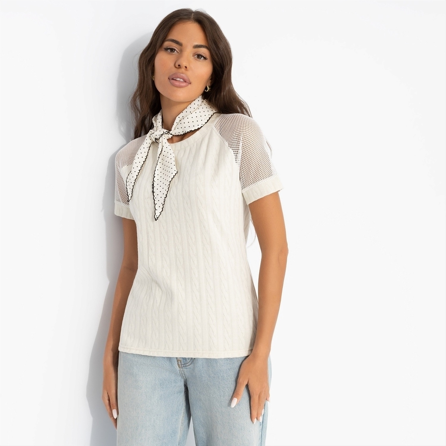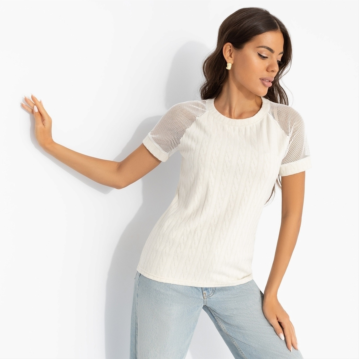 Она надела футболку ЧАРУТТИ в тот день, когда ей просто необходима была поддержка. Мягкая и комфортная, в нежном молочном цвете, она не ощущается на теле. Будто слегка обнимает за талию и нежно придерживает за плечи. Футболка прямого силуэта. Основной материал – текстурный. Рукава оформлены сеткой. Футболка хорошо смотрится в заправленном виде и навыпуск.