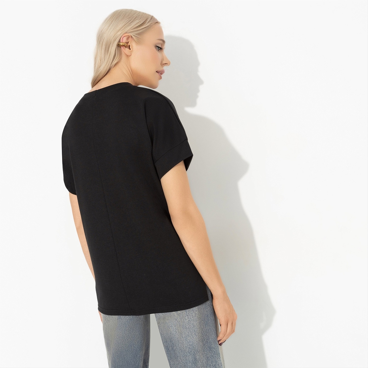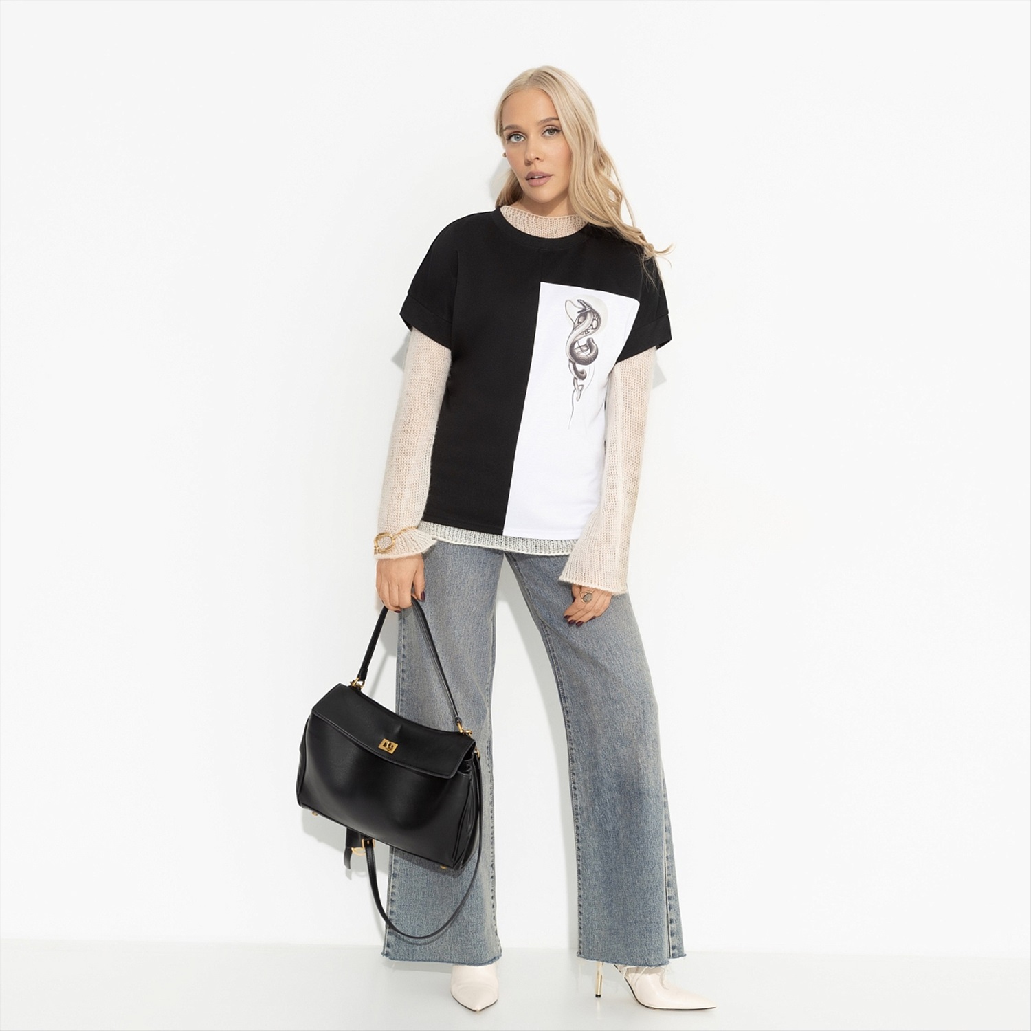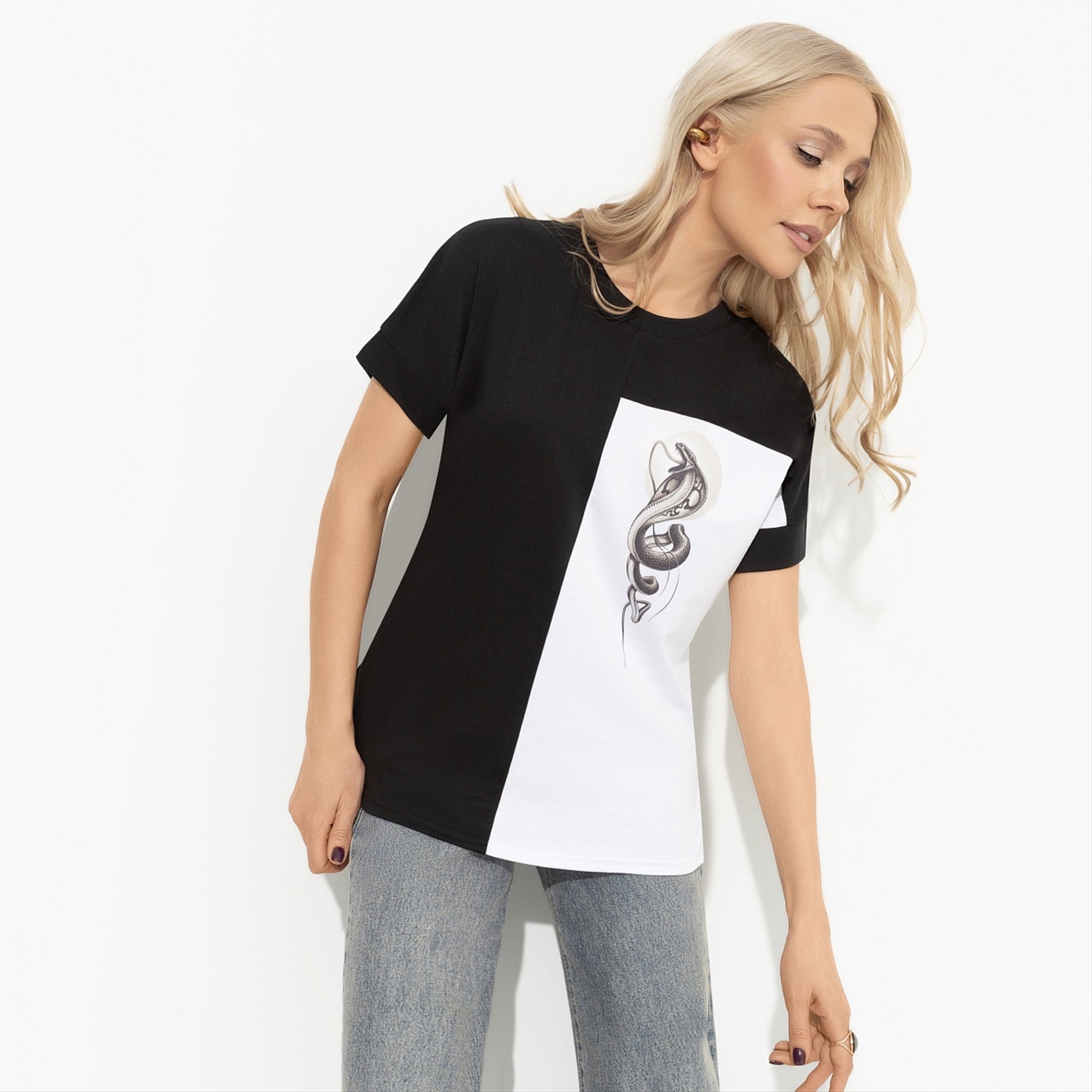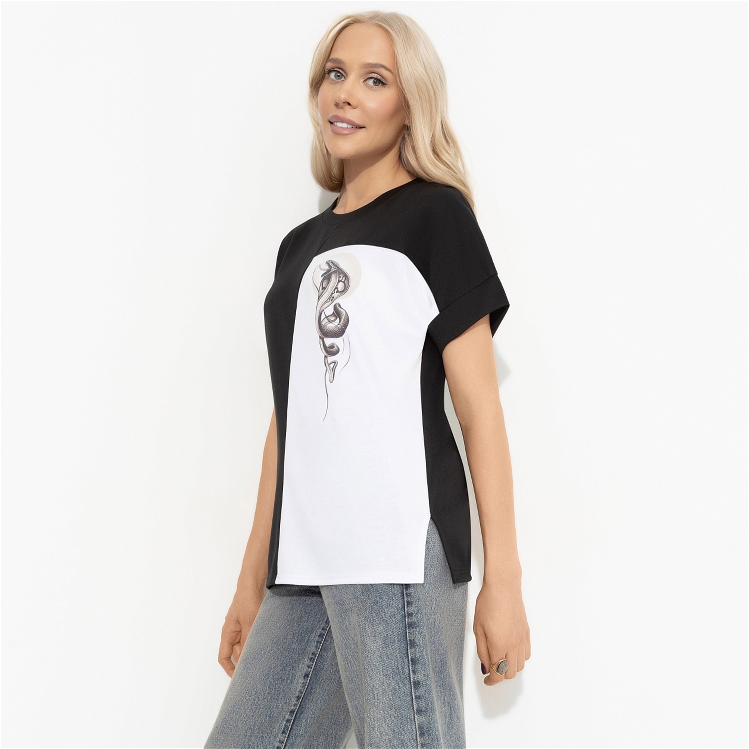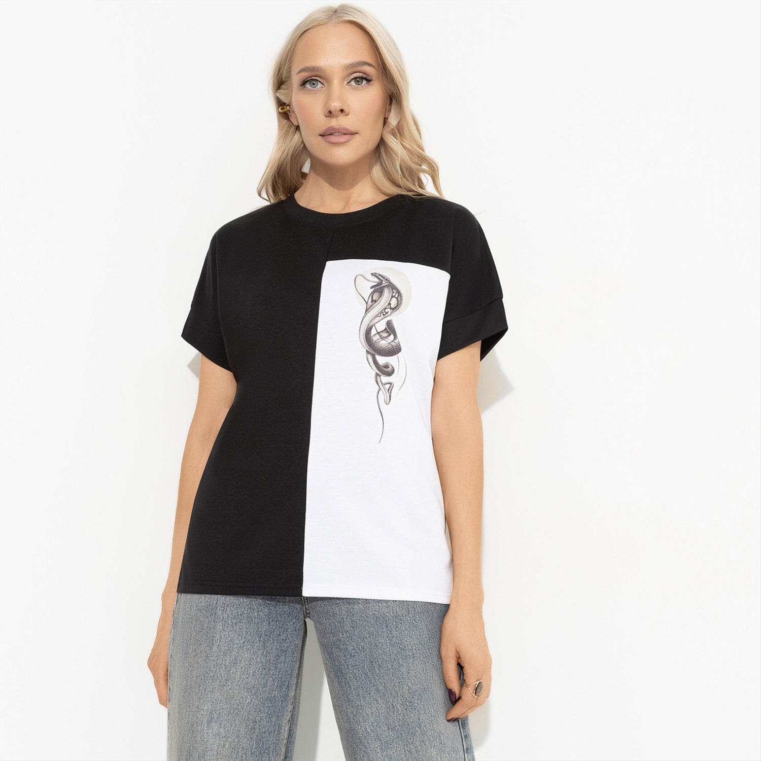 ТН ВЭД: 6109902000; Состав: «Милано» (65% п/э, 30% вискоза, 5% стрейч); Плотность ткани: Средняя; Тип ткани: Трикотаж; Вид застежки: Нет; Дополнительный цвет ткани: Белый; Карманы: Нет; Основной цвет ткани: Черный; Отрезная талия: Нет; Подклад: Нет; Резинка по талии: Нет; Рисунок/раппорт: Каждое изделие уникально из-за расположения рисунка на ткани; Сезон: Круглогодичный