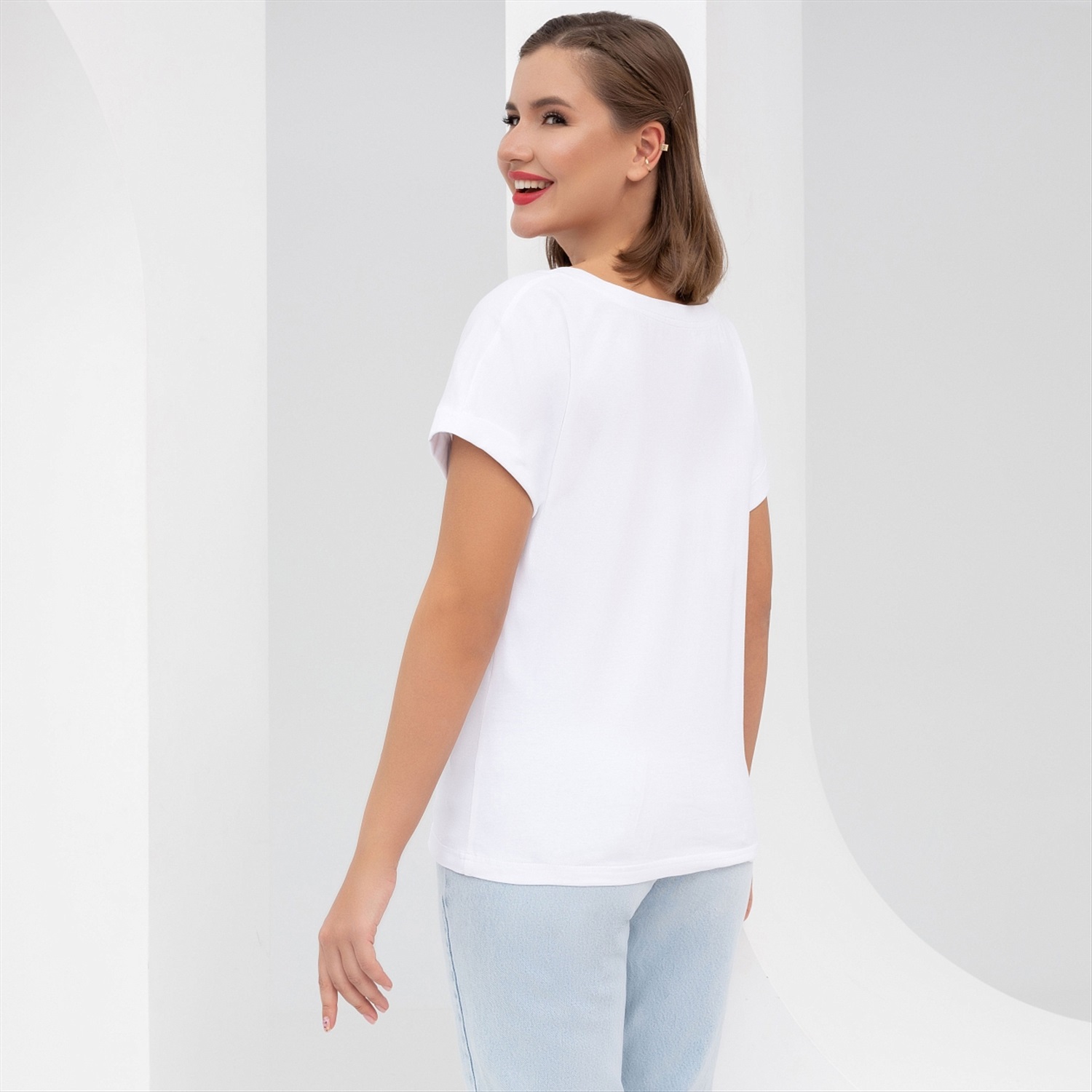 ТН ВЭД: 6109100000; Состав: «Кулирная гладь» (95% хлопок, 5% эластан); Тип ткани: Трикотаж; Дополнительный цвет ткани: Разноцветный; Основной цвет ткани: Белый; Сезон: Лето