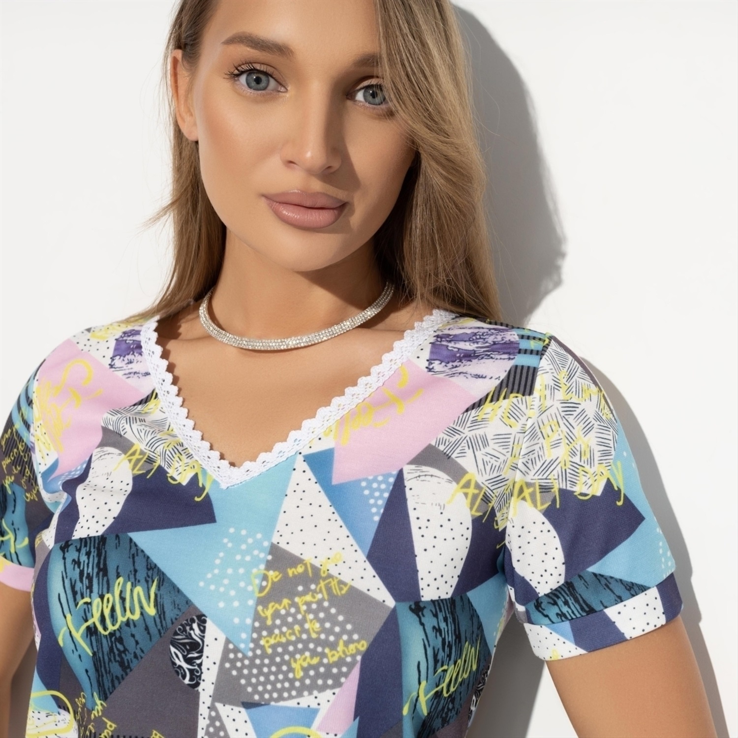 ТН ВЭД: 6109902000; Состав: Трикотаж «милано» (65% п/э, 30% вискоза, 5% стрейч); Плотность ткани: Средняя; Тип ткани: Трикотаж; Вид застежки: Нет; Дополнительный цвет ткани: Белый; Карманы: Нет; Основной цвет ткани: Разноцветный; Отрезная талия: Нет; Подклад: Нет; Резинка по талии: Нет; Рисунок/раппорт: Каждое изделие уникально из-за расположения рисунка на ткани; Сезон: Лето