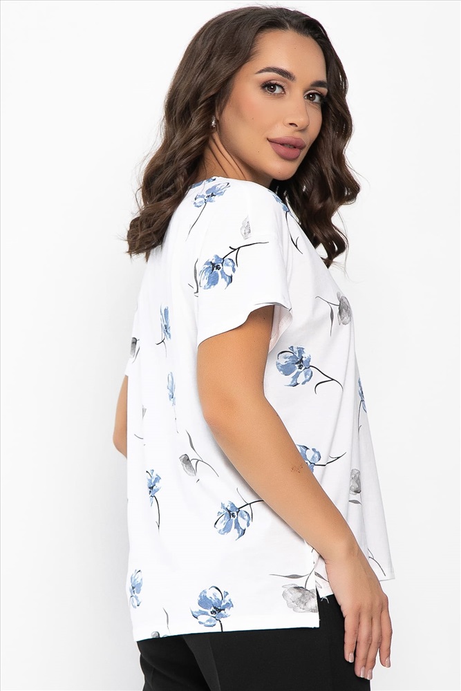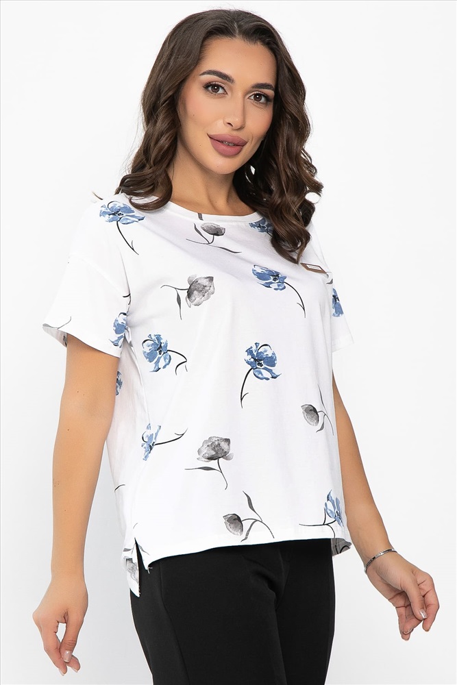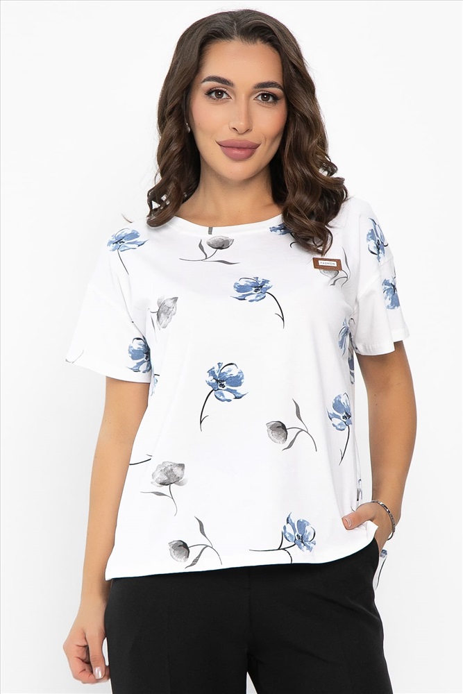 Футболка с принтом в виде цветов — это элегантное и модное дополнение к вашему гардеробу. На груди расположена декоративная нашивка, которая придаёт изделию уникальность. Модель с укороченным рукавом и спущенным плечом создаёт свободный и современный образ, который идеально подходит для повседневной носки или неформальных мероприятий. Длина передней части на 2 см меньше, что придаёт образу динамичность и стиль. Эта футболка — отличный выбор для тех, кто ценит удобство и хочет выглядеть ярко и современно.