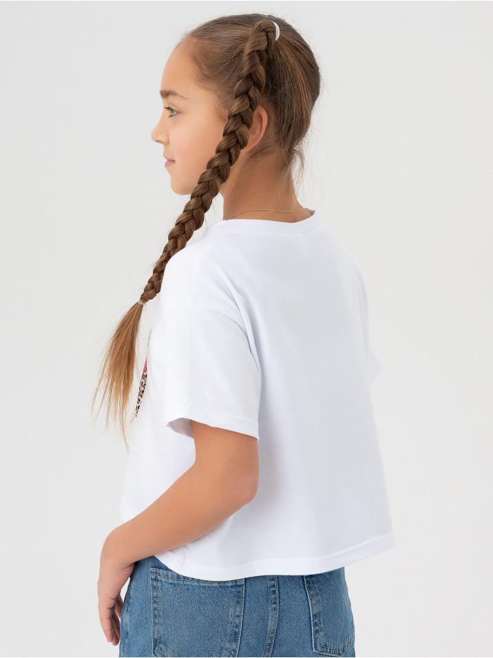 Стильная футболка для девочки с современным принтом в стиле оверсайз. Широкий размерный ряд охватывает разные возраста детей от дошкольников до школьников подростков или на возраст 6, 7, 8, 9, 10, 11, 12, 13 и 14 лет. Футболка классического прямого кроя с короткими рукавами и круглым вырезом горловины. Детская футболка на каждый день на прогулку, дачу, в садик, для дома, в школу. Удобная длина позволяет носить футболку заправленной и навыпуск . Отлично сочетается с шортами, джинсами, брюками, юбками. Модная хлопковая футболка, материал приятен на ощупь, позволяет телу дышать, при бережном уходе не дает усадку и не деформируется. Принт яркий и долговечный, напечатан по современным технологиям гипоаллергенной безопасной для кожи краской. Отличный подарок для девочки на день рождения и без повода.