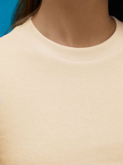 Оптовая продажа. Футболка женская из трикотажа кашкорсе, укороченная, с короткими рукавами, круглым вырезом горловины, однотонная.