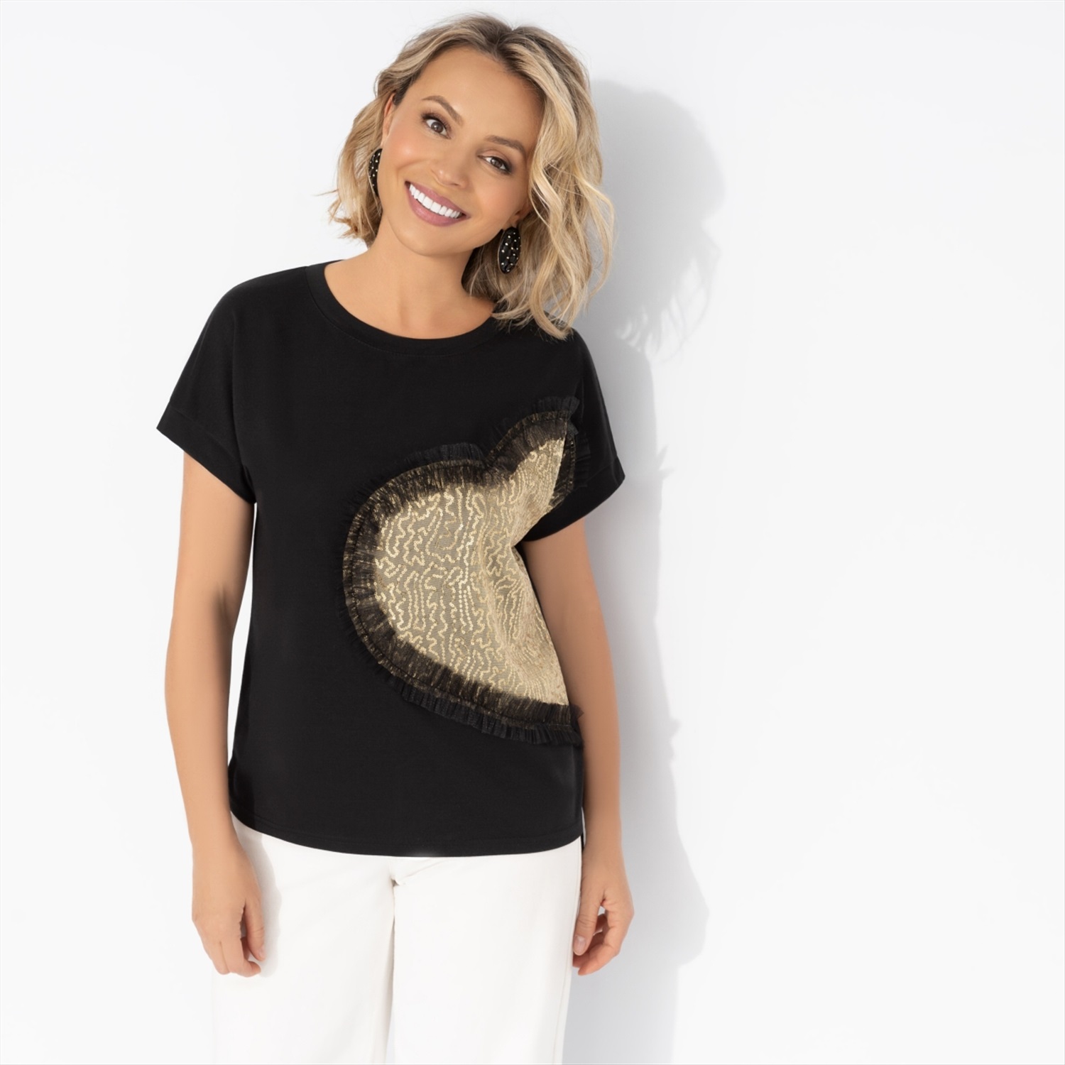 Модный must-have. Футболка ЧАРУТТИ – идеальное сочетание лаконичности и шика. Черная основа подчеркивает элегантность, а мерцающие золотые пайетки добавляют ноту праздника даже в повседневный образ. Футболка сочетается с кожаной юбкой для вечернего выхода или с рваными джинсами для дерзкого уличного стиля. Футболка свободного кроя. Изделие слегка удлиненное. На передней стороне декор из пайеток и сетчатой ткани. Паетки и сетка прошиты.