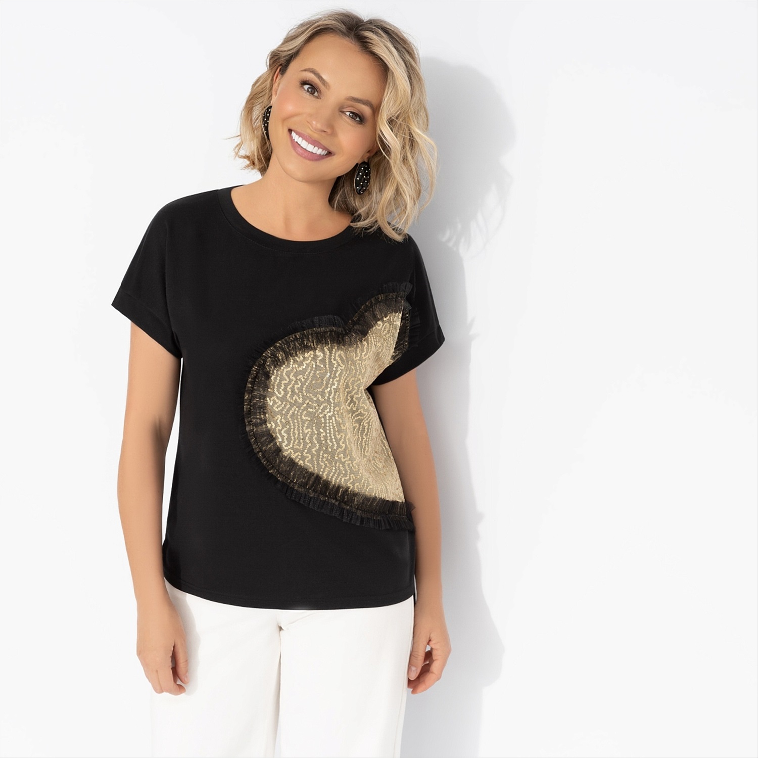 Модный must-have. Футболка ЧАРУТТИ – идеальное сочетание лаконичности и шика. Черная основа подчеркивает элегантность, а мерцающие золотые пайетки добавляют ноту праздника даже в повседневный образ. Футболка сочетается с кожаной юбкой для вечернего выхода или с рваными джинсами для дерзкого уличного стиля. Футболка свободного кроя. Изделие слегка удлиненное. На передней стороне декор из пайеток и сетчатой ткани. Паетки и сетка прошиты.