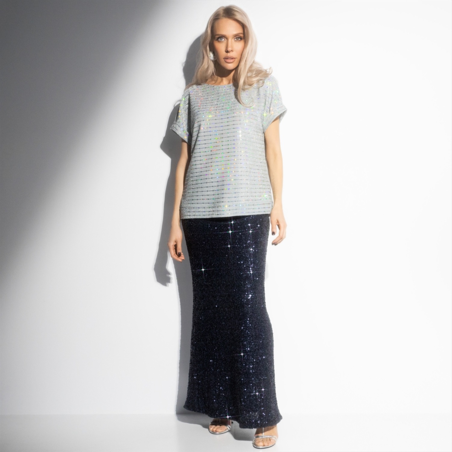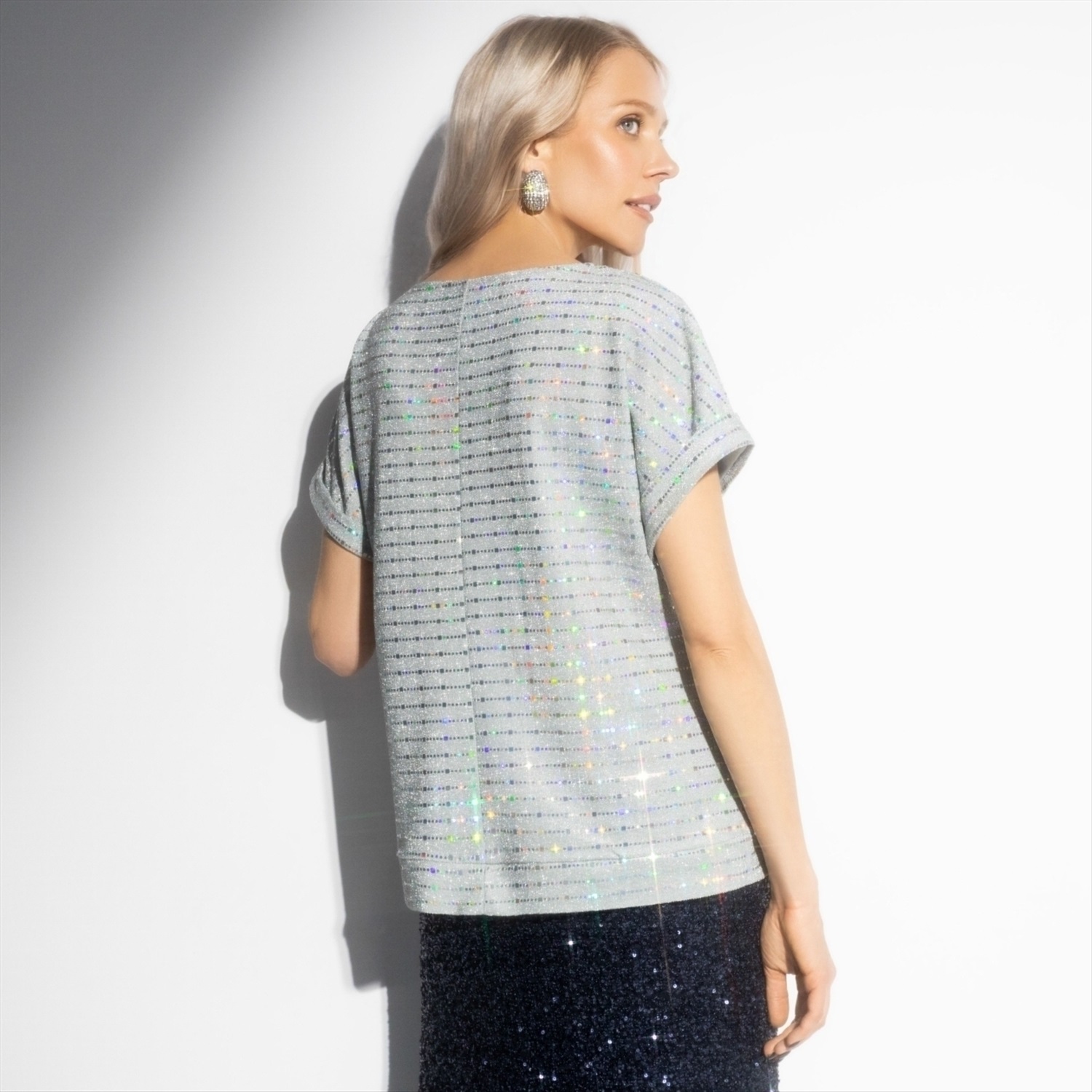 Она просто отправилась на вечеринку, не подозревая, что Вселенная уже приготовила для неё ответ на сокровенное желание. Вдруг ‒ на перекрёстке взглядов кто-то улыбается в ответ. Чудеса любят тех, кто готов блистать! Футболка со свободной посадкой из серебристого трикотажа с акцентным блестящим декором. Идеально, чтобы быть заметной и ждать своё чудо ‒ в кругу близких и в случайной встрече на улице.
