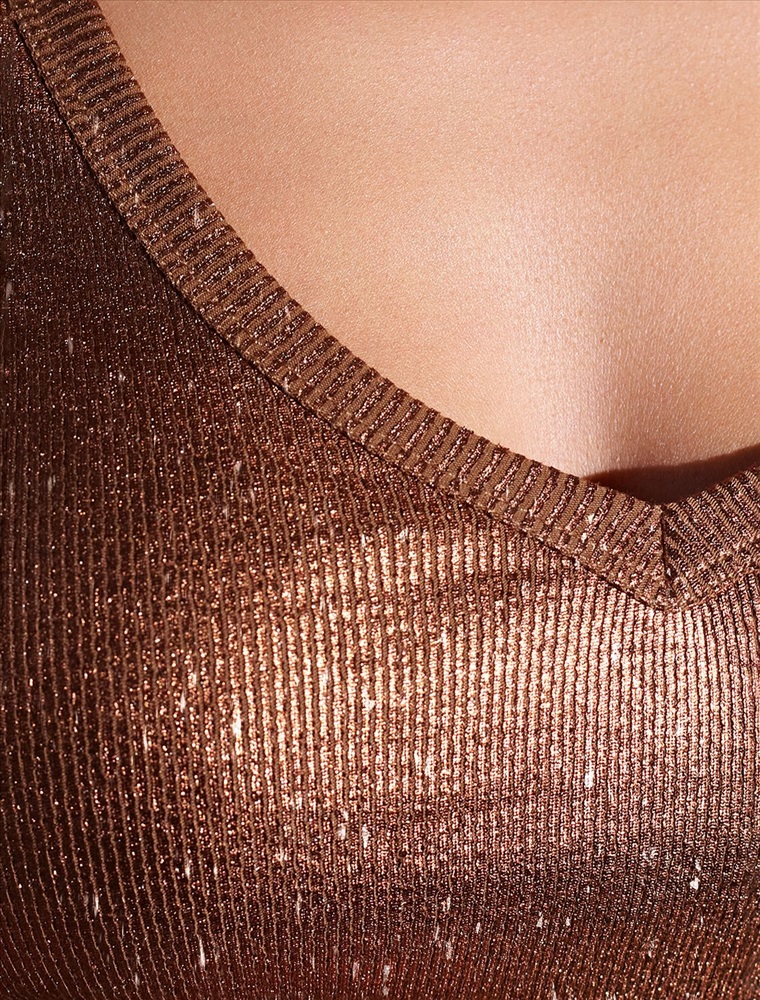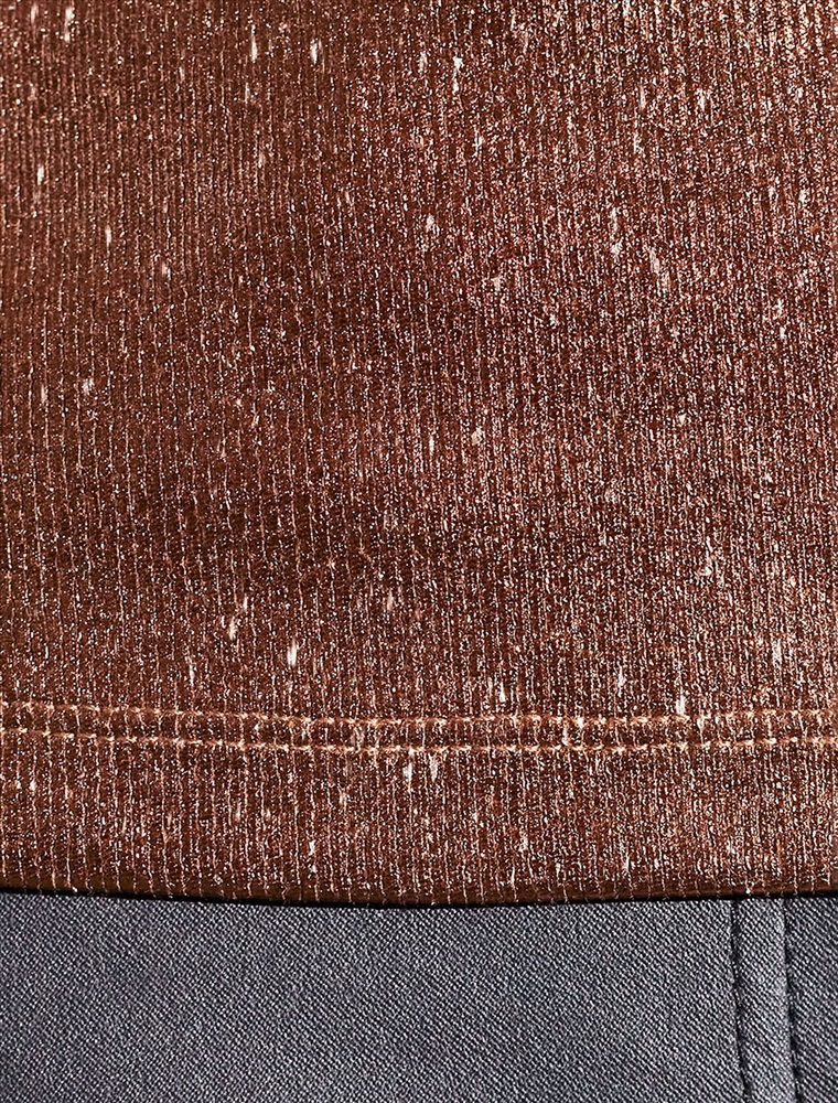 Стильная футболка кофейного цвета с V вырезом выполнена из премиального хлопка с добавлением эластана. Эффектное матовое бронзовое покрытие металлик с серебристыми вкраплениями придает футболке изысканный блеск. Чуть удлиненные рукава и глубокий вырез, открывающий область декольте, добавляют женственность и элегантность образу. Мелкий рубчик визуально вытягивает силуэт, за счет эластана в составе материал прекрасно тянется и садится на любую фигуру, в том числе большие размеры. Ткань износостойкая, сохраняет свой превоначальный вид даже после многочисленных стирок, отличается мягкостью и приятными тактильными ощущениями, такой материал не раздражает кожу, дарит ощущение уюта даже при длительном ношении, а воздухопроницаемость позволяет коже свободно дышать.