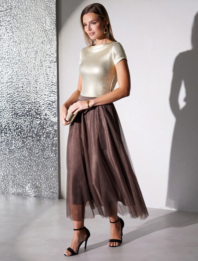Повседневная футболка универсальна: она сочетается с джинсами, юбками или строгими брюками — легко создать как деловой образ для офиса, так и наряд для вечеринки или ужина вне дома. Матовое покрытие создает благородный блеск без лишней яркости, благодаря чему футболка смотрится свежо и актуально.