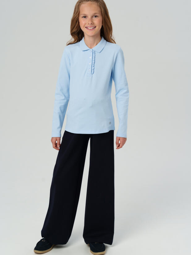 Школьная голубая футболка поло с длинным рукавом для девочки подростка от PlayToday — стильная и удобная альтернатива классической рубашке. Лаконичный крой, аккуратные детали и комфортный материал делают это базовое поло для девочек идеальным выбором для школы и повседневных образов.