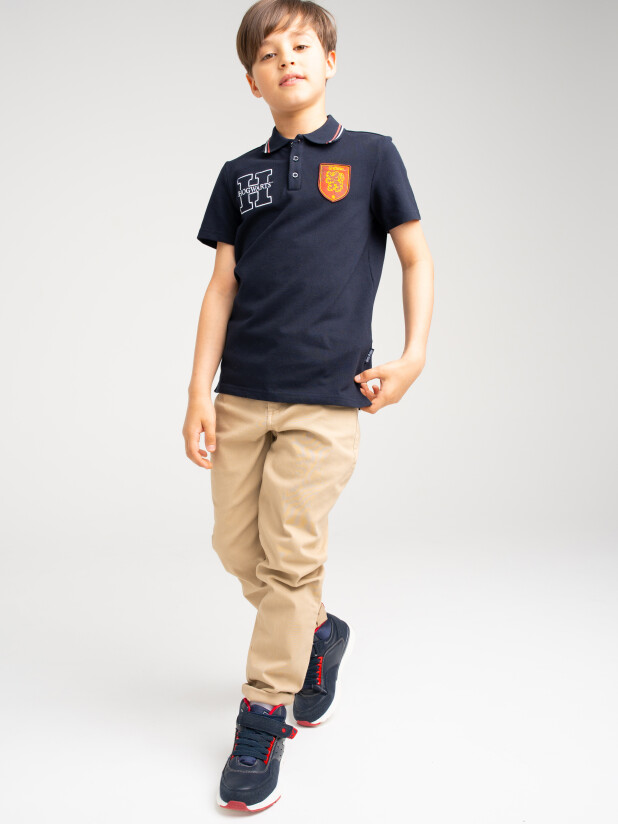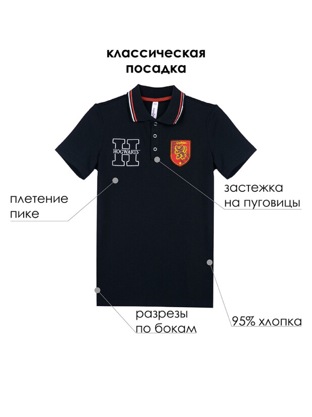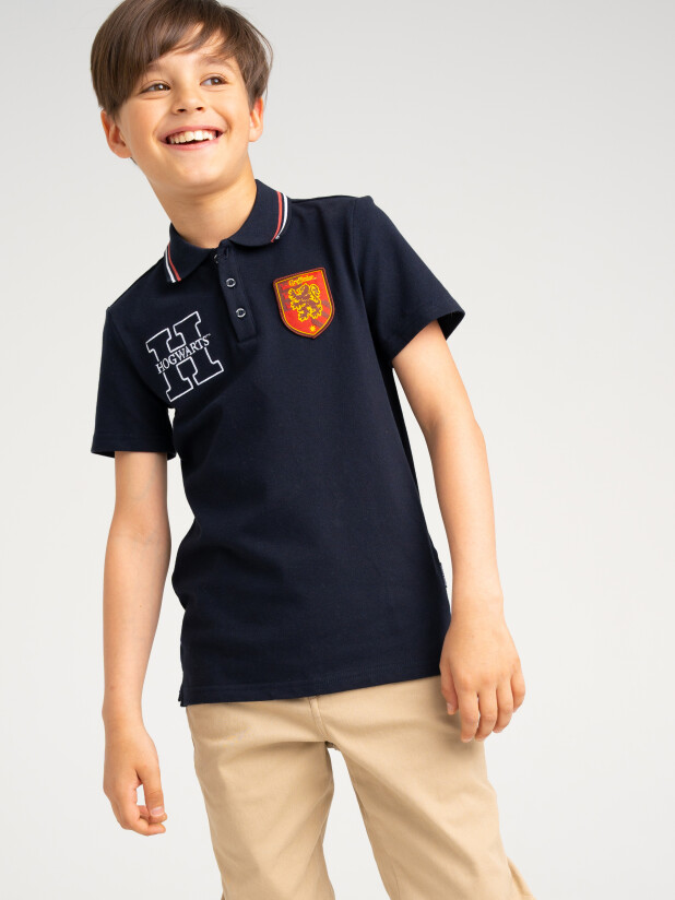 Лицензионная темно-синяя школьная футболка поло с коротким рукавом для мальчика подростка из коллекции Back to Hogwarts по мотивам вселенной Гарри Поттер (Warner Bros.) от PlayToday — стильный и удобный выбор для школы и повседневных образов. Это стильное подростковое поло украшено жаккардовым шевроном с эмблемой факультета Гриффиндор.