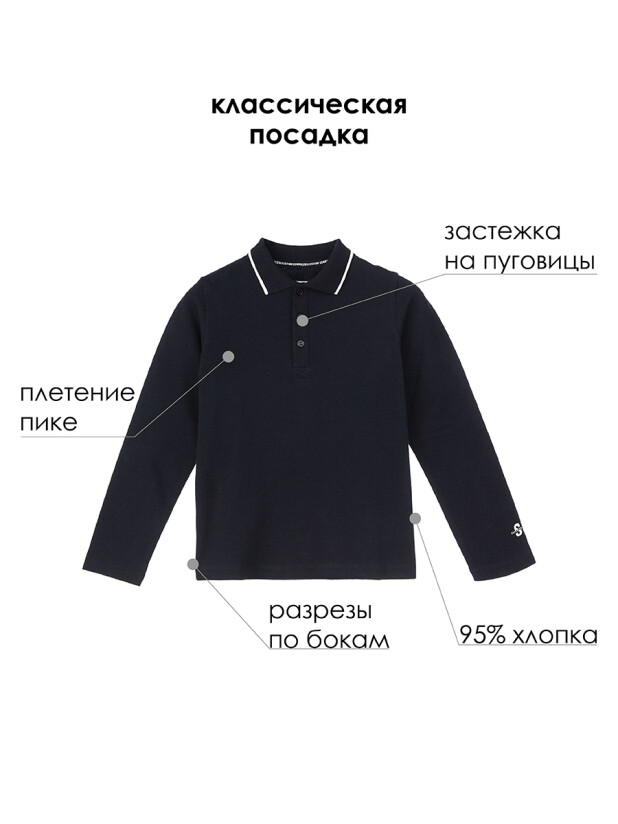 Это детское поло с длинным рукавом для мальчика-подростка выполнено из приятного на ощупь трикотажа пике, который хорошо дышит, мягко прилегает к телу и позволяет коже свободно “дышать” в течение дня. Добавление эластана делает ткань эластичной — футболка поло для школы не вытягивается и легко переносит частые стирки.