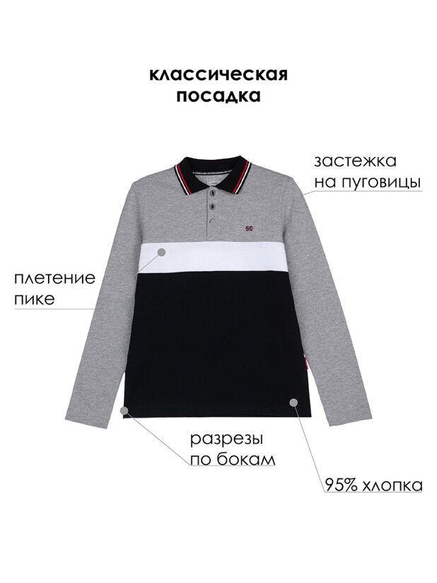 Это классическое серое поло для мальчика с длинным рукавом и контрастным воротником выполнено из плотного фактурного трикотажного полотна пике. Хлопок в составе обеспечивает комфорт, воздухопроницаемость и гипоаллергенность, а эластан помогает изделию сохранять форму и опрятный вид даже после множества стирок.