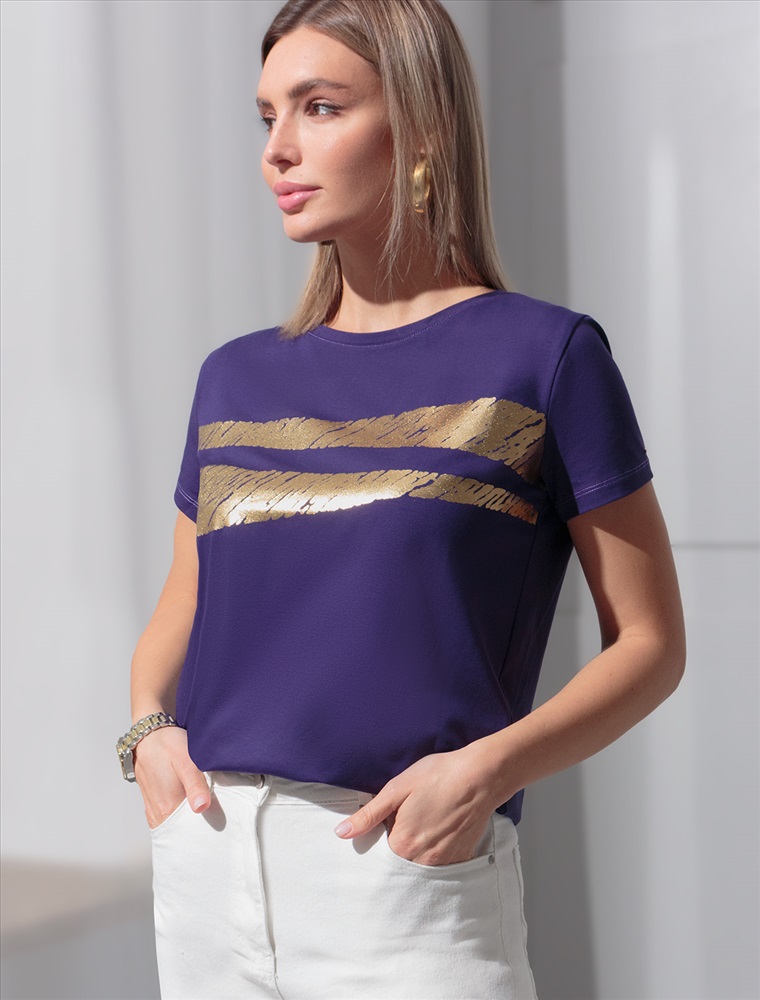 Параметры модели на первом фото: Рост 170, бюст 89, талия 63, бедра 92 Футболка из премиального хлопка. Авторский принт выполнен золотой фольгой. Изделие украшено металлическим логотипом бренда. Самое высокое качество хлопковых волокон с добавлением эластана. Идеально держит форму и сохраняет внешний вид в течение договременного использования. Комментарии к товару