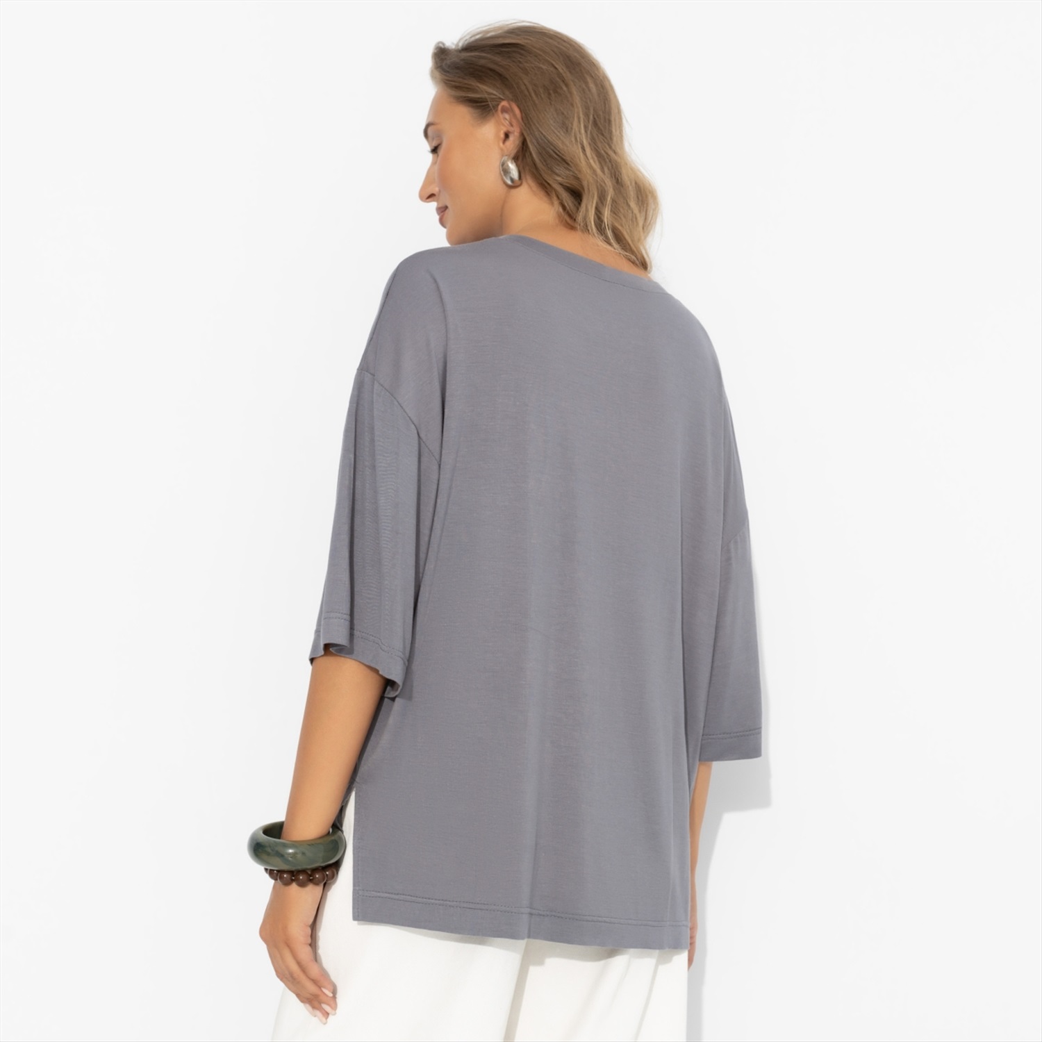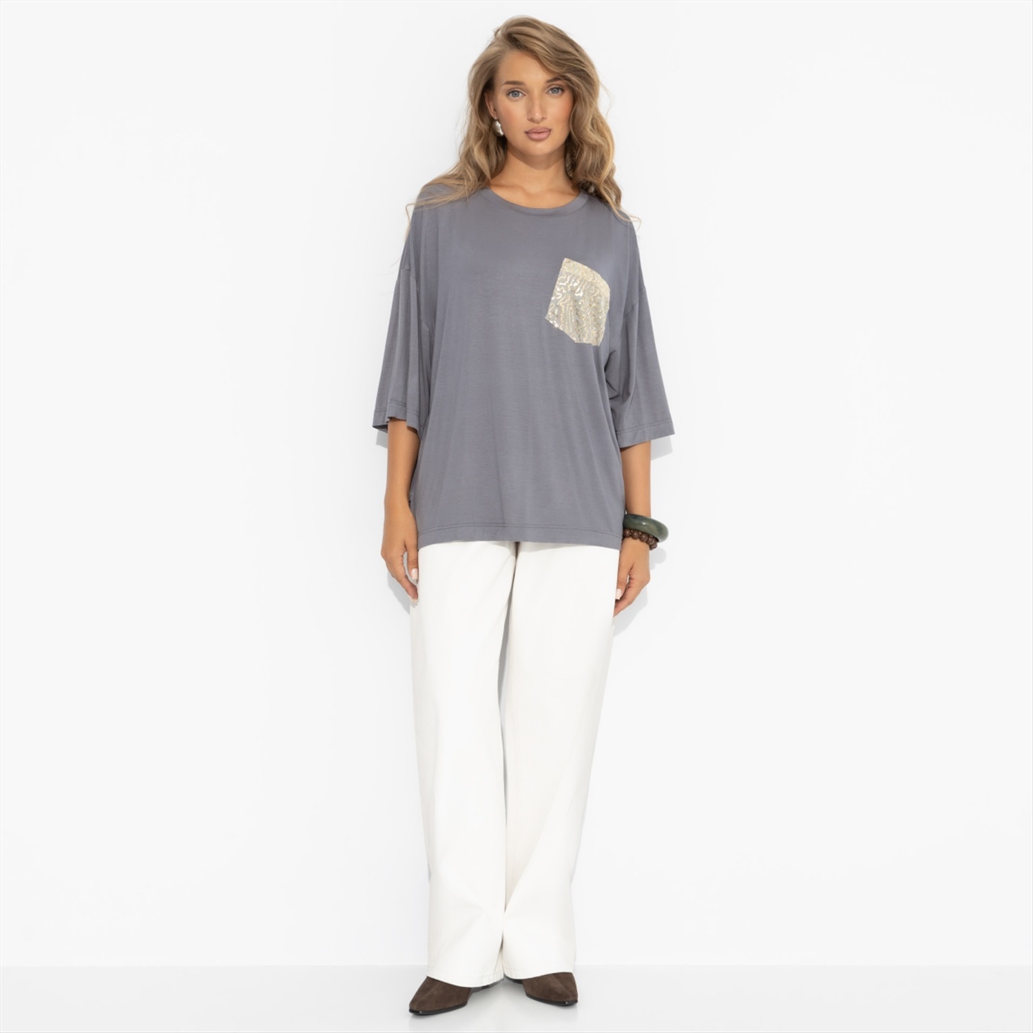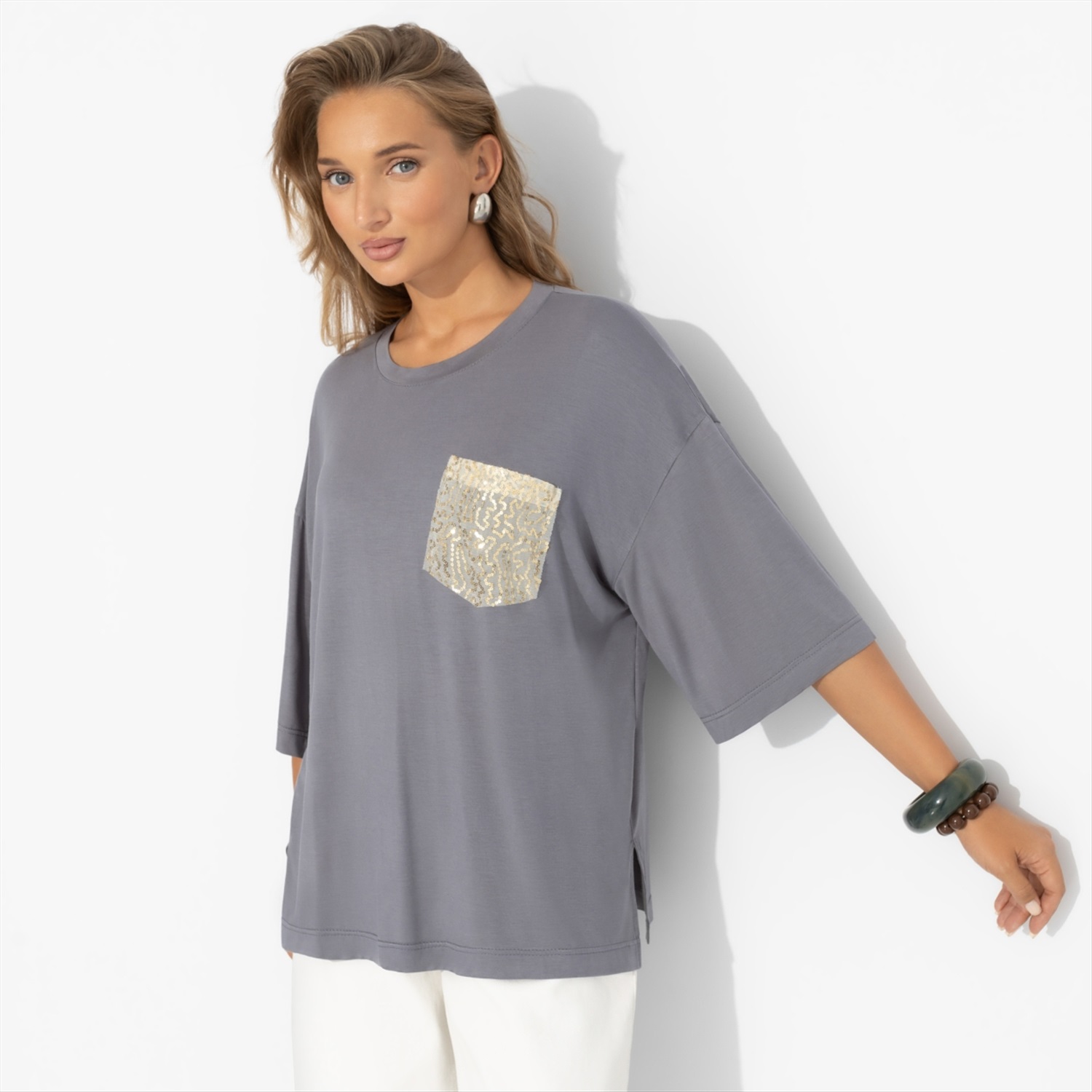 ТН ВЭД: 6109909000; Состав: Вискоза (90% вискоза, 10% эластан); Плотность ткани: Тонкая; Тип ткани: Трикотаж; Вид застежки: Нет; Декоративные элементы: Пайетки; Дополнительный цвет ткани: Золотой; Карманы: Накладные; Основной цвет ткани: Серый; Отрезная талия: Нет; Подклад: Нет; Резинка по талии: Нет; Рисунок/раппорт: Каждое изделие уникально из-за расположения рисунка на ткани; Сезон: Круглогодичный; Силуэт: Свободный; Стиль: Повседневный