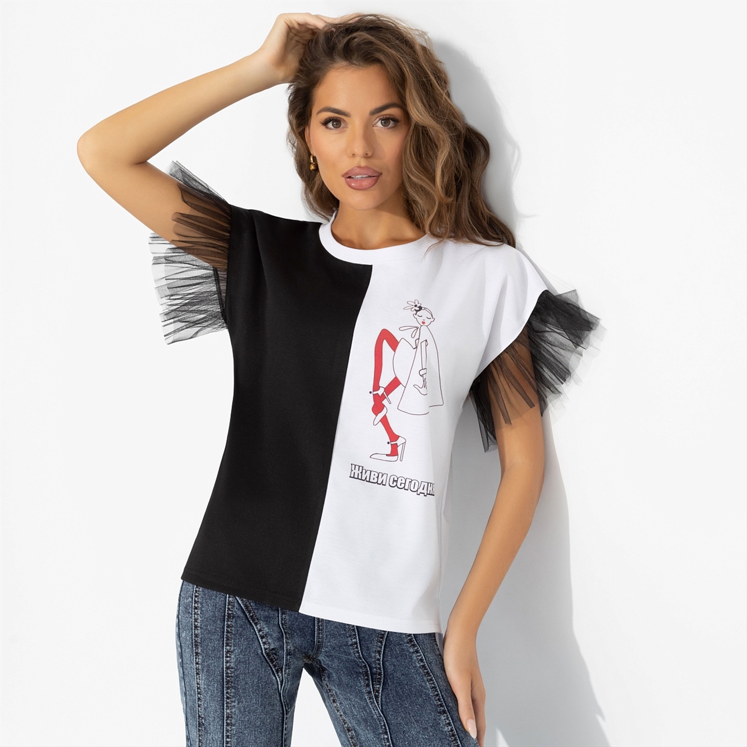 Искра, буря, безумие… В такой футболке-заявлении от ЧАРУТТИ вы всегда ‒ то самое первое впечатление: контрасты, акцентные рукава и стиль, который запоминается с первой секунды. Живи сегодня! Футболка из трикотажа «милано» с черно-белым колорблоком и рукавами из фатина. То, что нужно для событий и встреч, где важна харизма. Надпись на изделии: «Живи сегодня!».