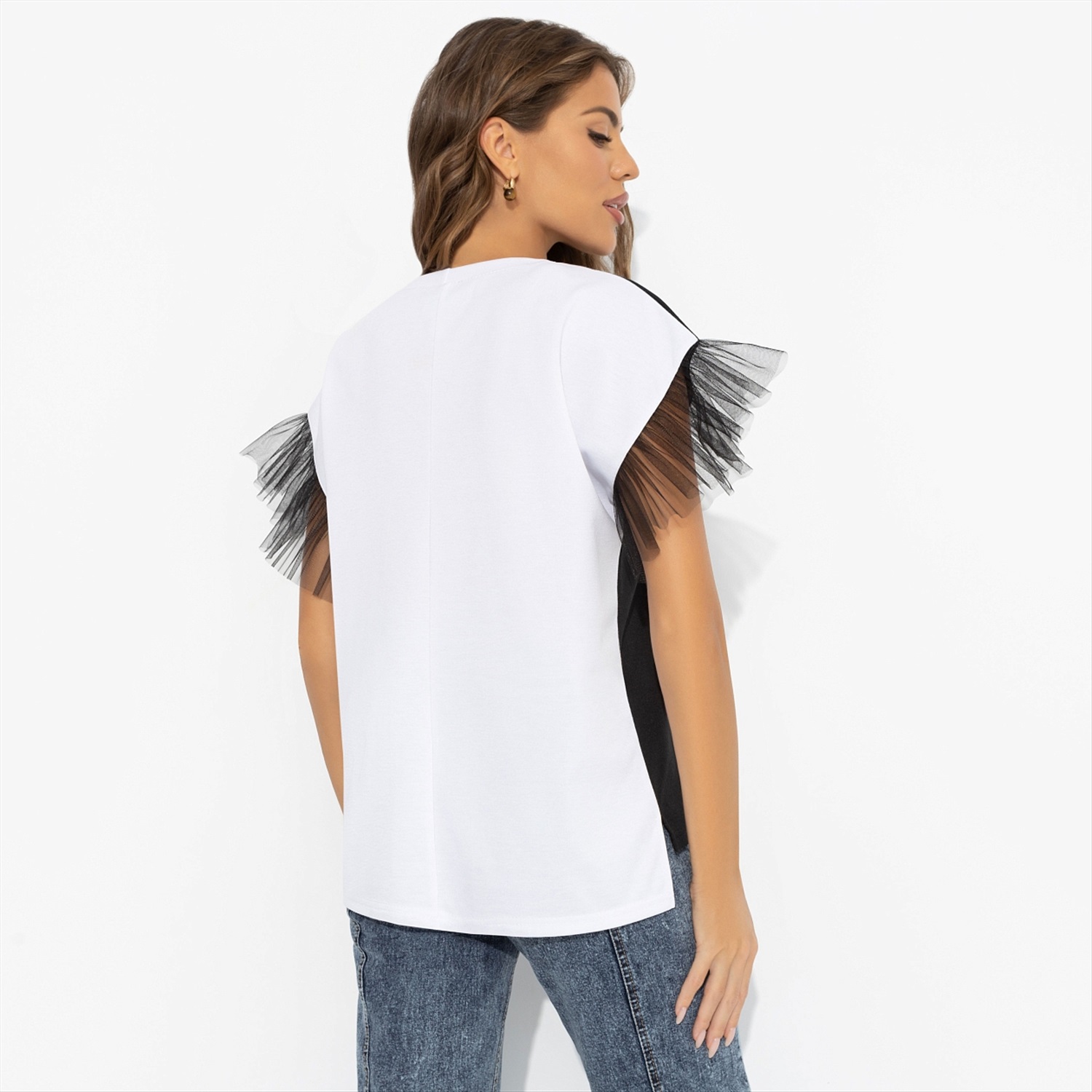 ТН ВЭД: 6109909000; Состав: Трикотаж «милано» (65% п/э, 30% вискоза, 5% стрейч); Плотность ткани: Средняя; Тип ткани: Трикотаж; Декоративные элементы: Рюши; Дополнительный цвет ткани: Черный; Карманы: Нет; Основной цвет ткани: Белый; Отрезная талия: Нет; Подклад: Нет; Резинка по талии: Нет; Рисунок/раппорт: Каждое изделие уникально из-за расположения рисунка на ткани; Сезон: Круглогодичный