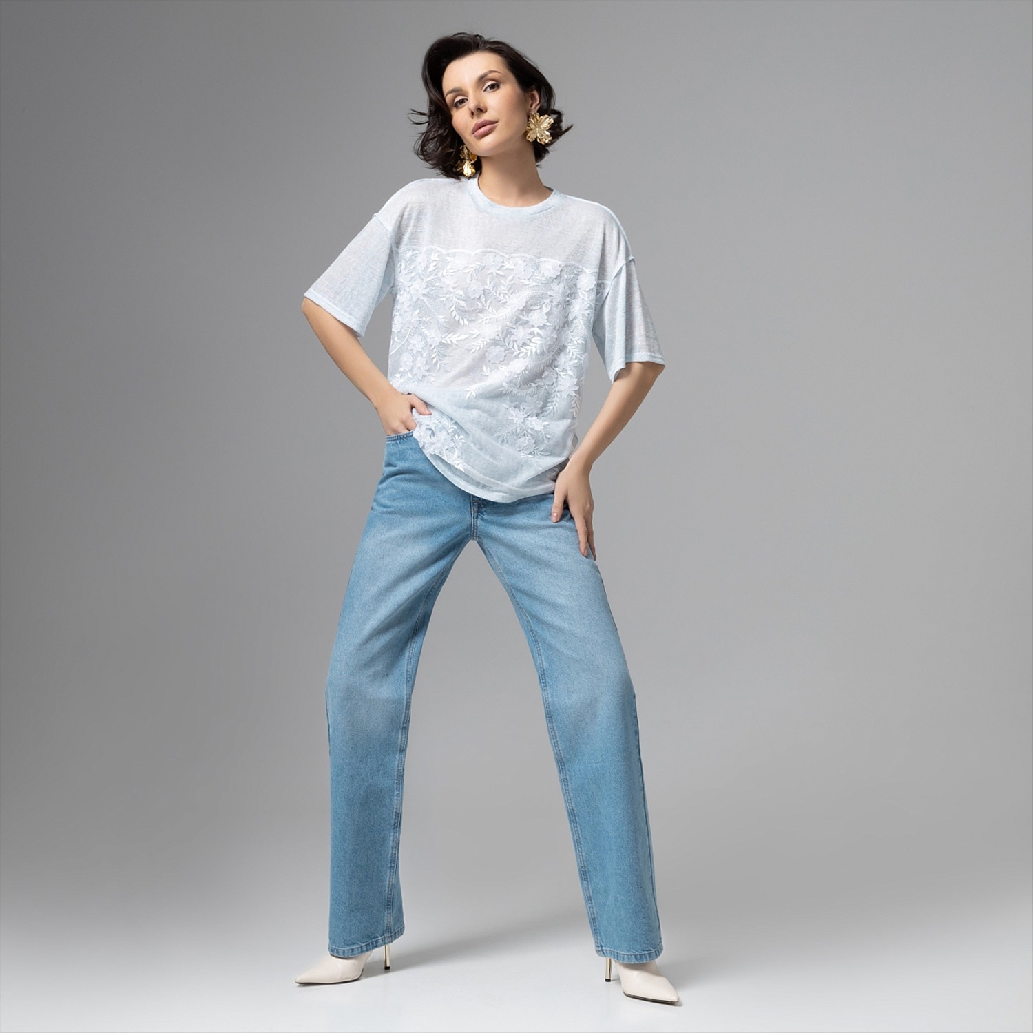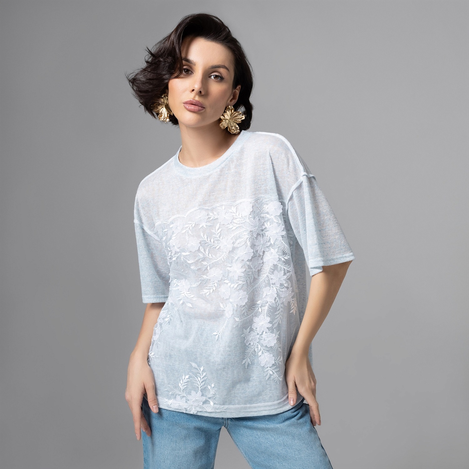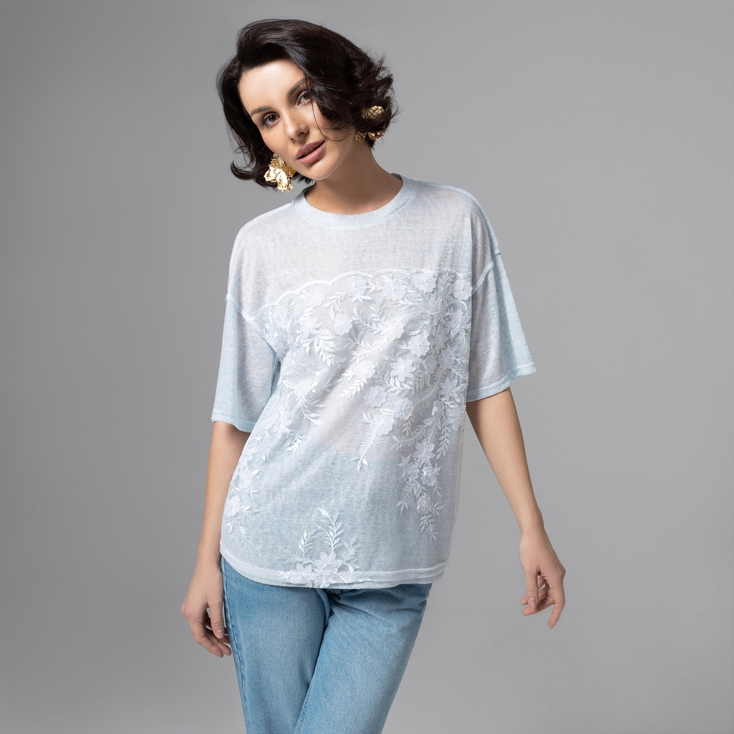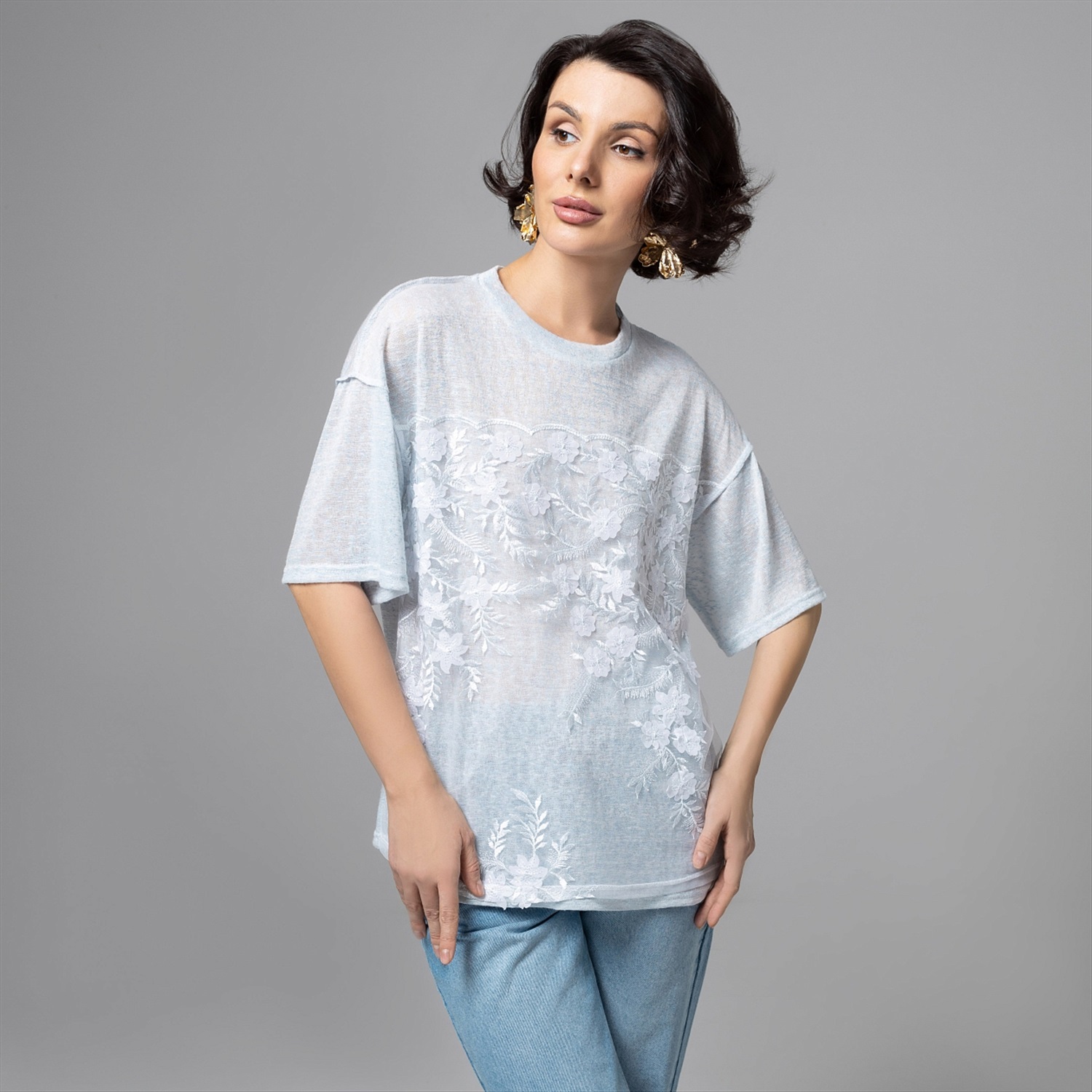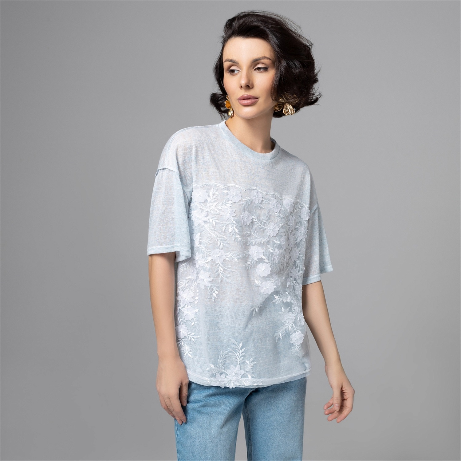 Haute couture – только в формате удобной футболки и по доступной цене. Носите её с простыми джинсами, белыми кедами или юбкой‑миди, и каждый раз образ будет смотреться по‑разному, но одинково эффектно. Сетка с вышивкой даёт легкость и фактурный рельеф, эту ткань часто исспользуют в вечерних и свадебных коллекциях, поэтому образ считывается максимально утончённым. Швы наружу создают дополнительный акцент.
