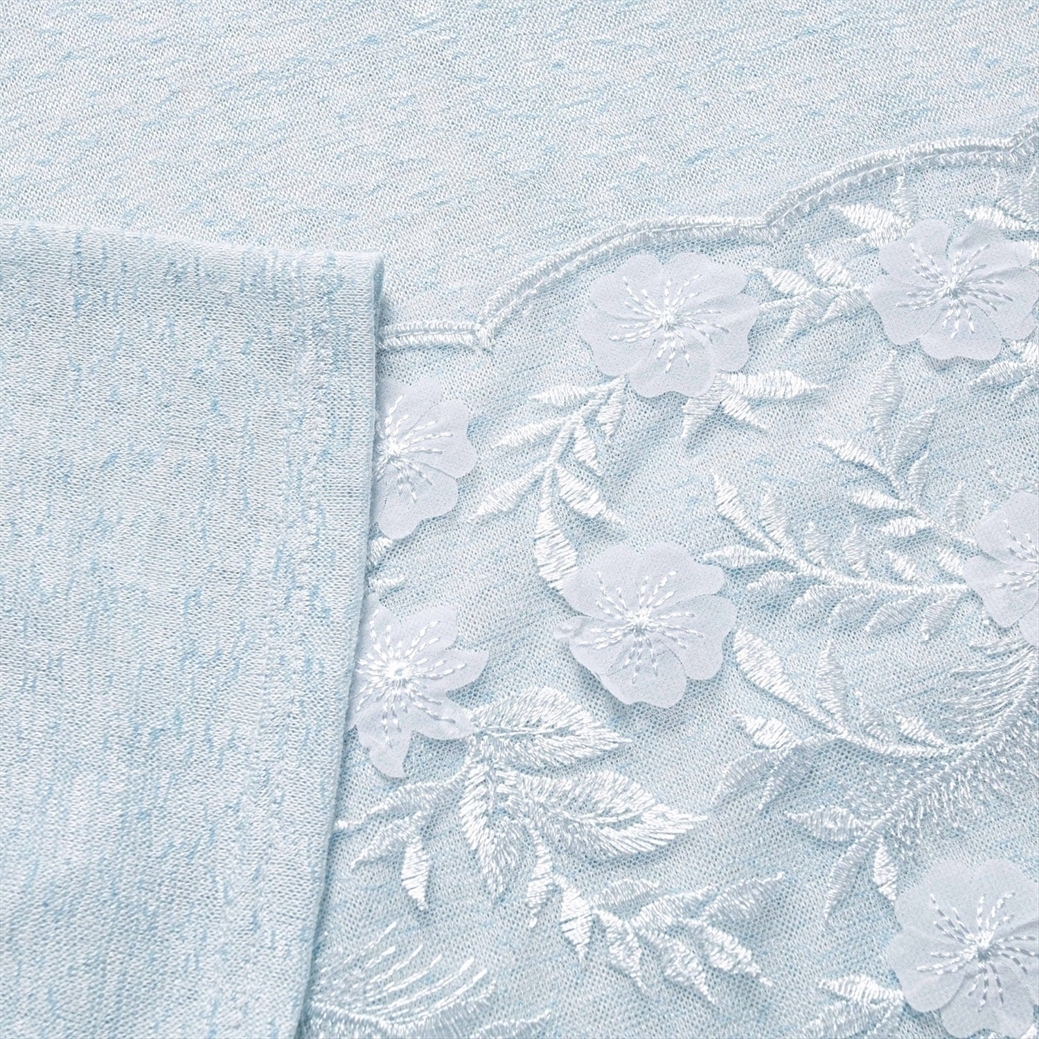 ТН ВЭД: 6109909000; Состав: Трикотаж «жаккард», сетка с вышивкой (65% п/э, 30% вискоза, 5% спандекс); Плотность ткани: Тонкая; Тип ткани: Трикотаж; Вид застежки: Нет; Декоративные элементы: Швы наружу изделия; Дополнительный цвет ткани: Белый; Карманы: Нет; Основной цвет ткани: Голубой; Отрезная талия: Нет; Подклад: Нет; Резинка по талии: Нет; Рисунок/раппорт: Нет, все изделия идентичны; Сезон: Круглогодичный; Силуэт: Свободный; Стиль: Повседневный