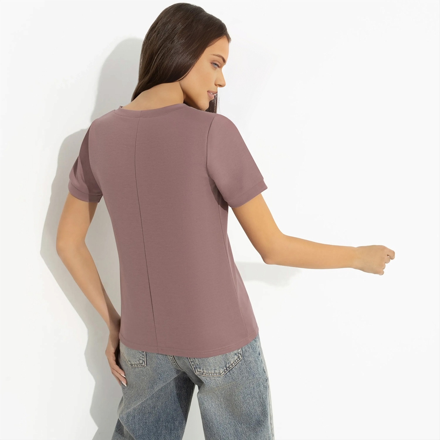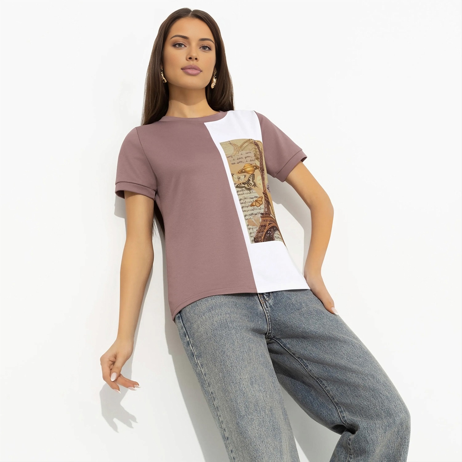 ТН ВЭД: 6109902000; Состав: «Милано» (65% п/э, 30% вискоза, 5% стрейч); Плотность ткани: Средняя; Тип ткани: Трикотаж; Вид застежки: Нет; Декоративные элементы: Другое; Карманы: Нет; Основной цвет ткани: Розовый; Отрезная талия: Нет; Подклад: Нет; Резинка по талии: Нет; Рисунок/раппорт: Каждое изделие уникально из-за расположения рисунка на ткани; Сезон: Круглогодичный; Силуэт: Прилегающий; Стиль: Повседневный