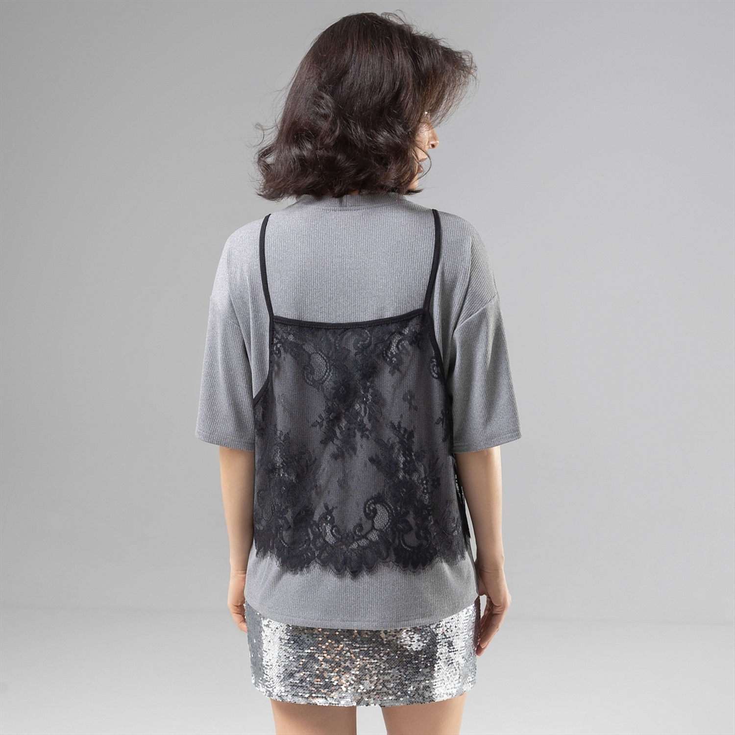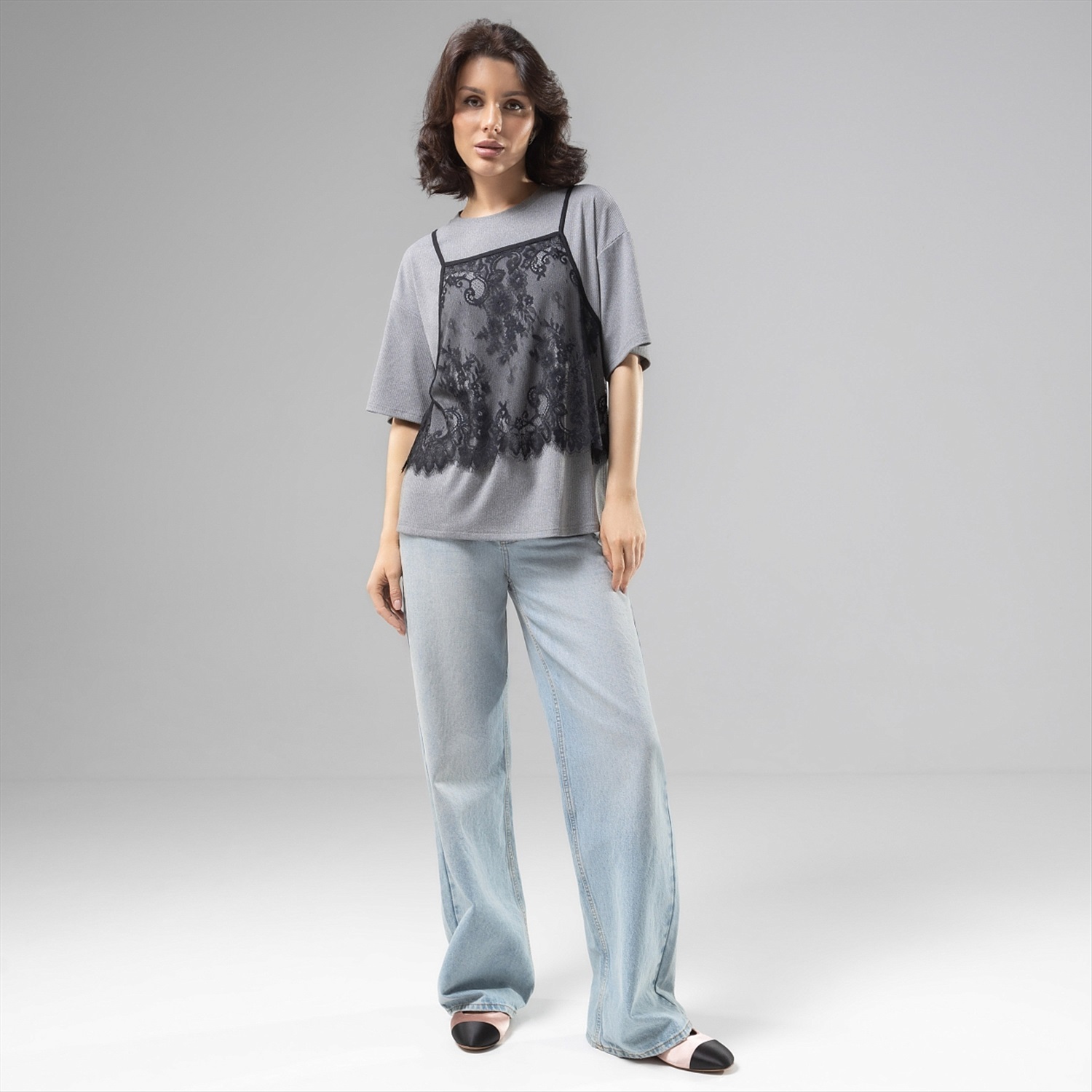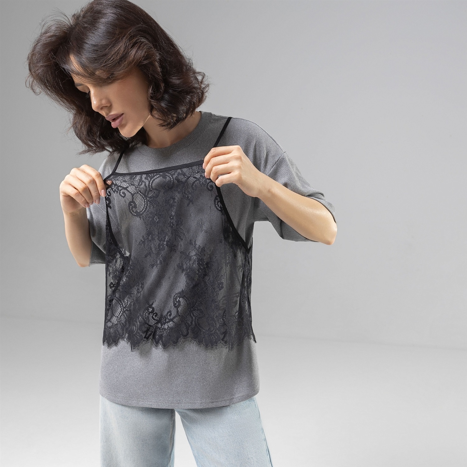 Высокий стиль требует изобретательности. Умение удивлять и вызывать уважение делает вас неподражаемой. Подтвердите свое модное превосходство футболкой CHARUTTI. Футболка свободного кроя. Материал футболки в деликатный рубчик. Топ из кружева – съемный. Топ на тонких бретелях. Все швы изделия обработаны.