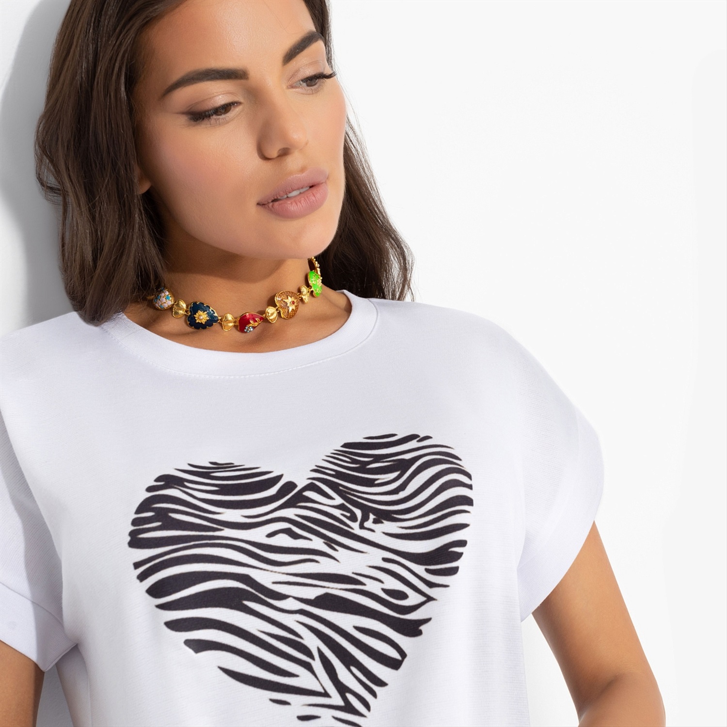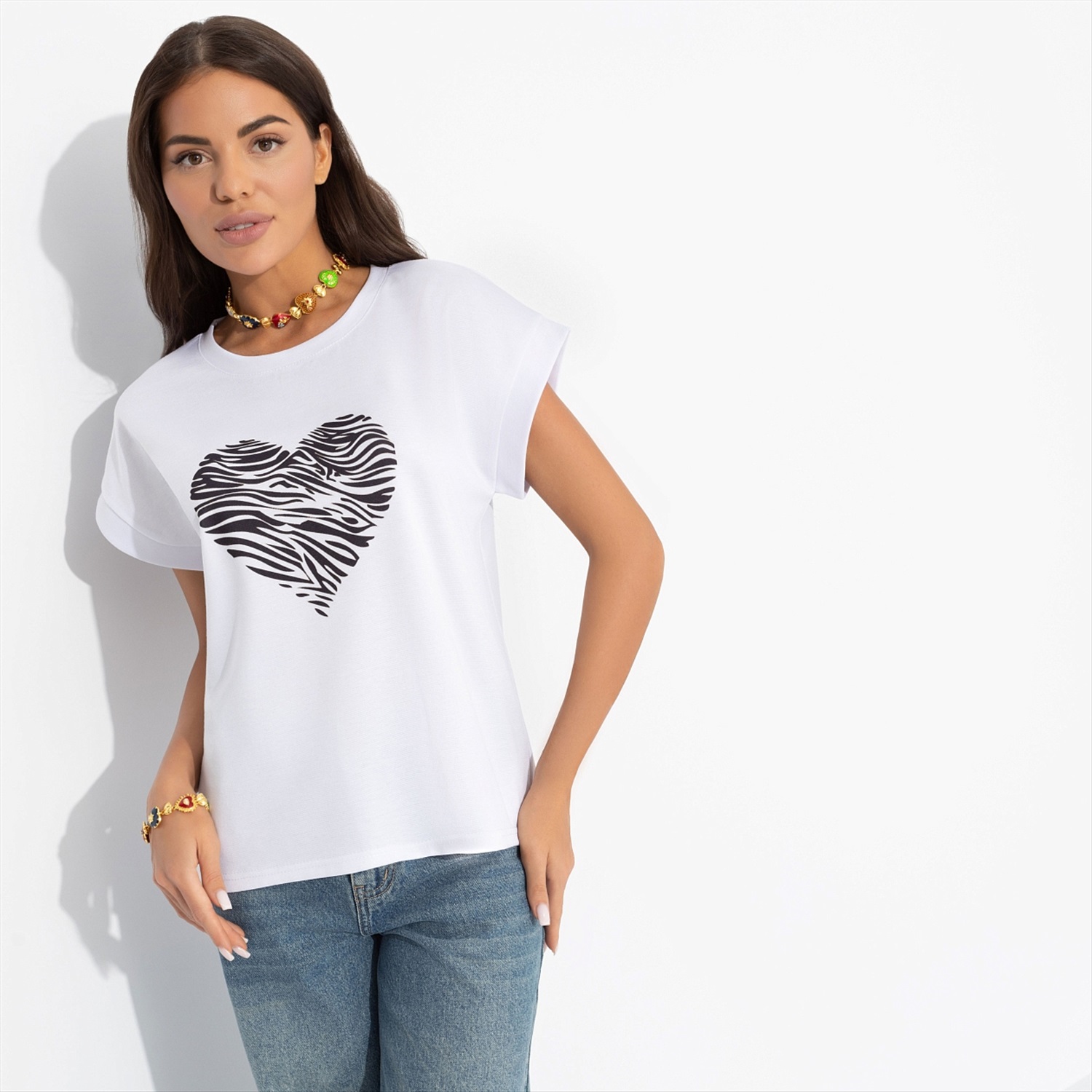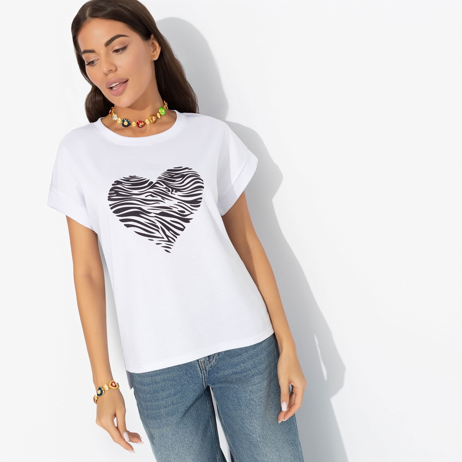 Вы открыты для всех и всего. Но в первую очередь для футболки от ЧАРУТТИ. Потому что это полный match. Ваши сердца звучат в унисон. Футболка прямого кроя. Спинка чуть длиннее передней. Сердечко с анималистическим флером. Цельнокроеный рукав, отвороты прошиты. Изделие хорошо смотрится в заправленном виде и навыпуск.