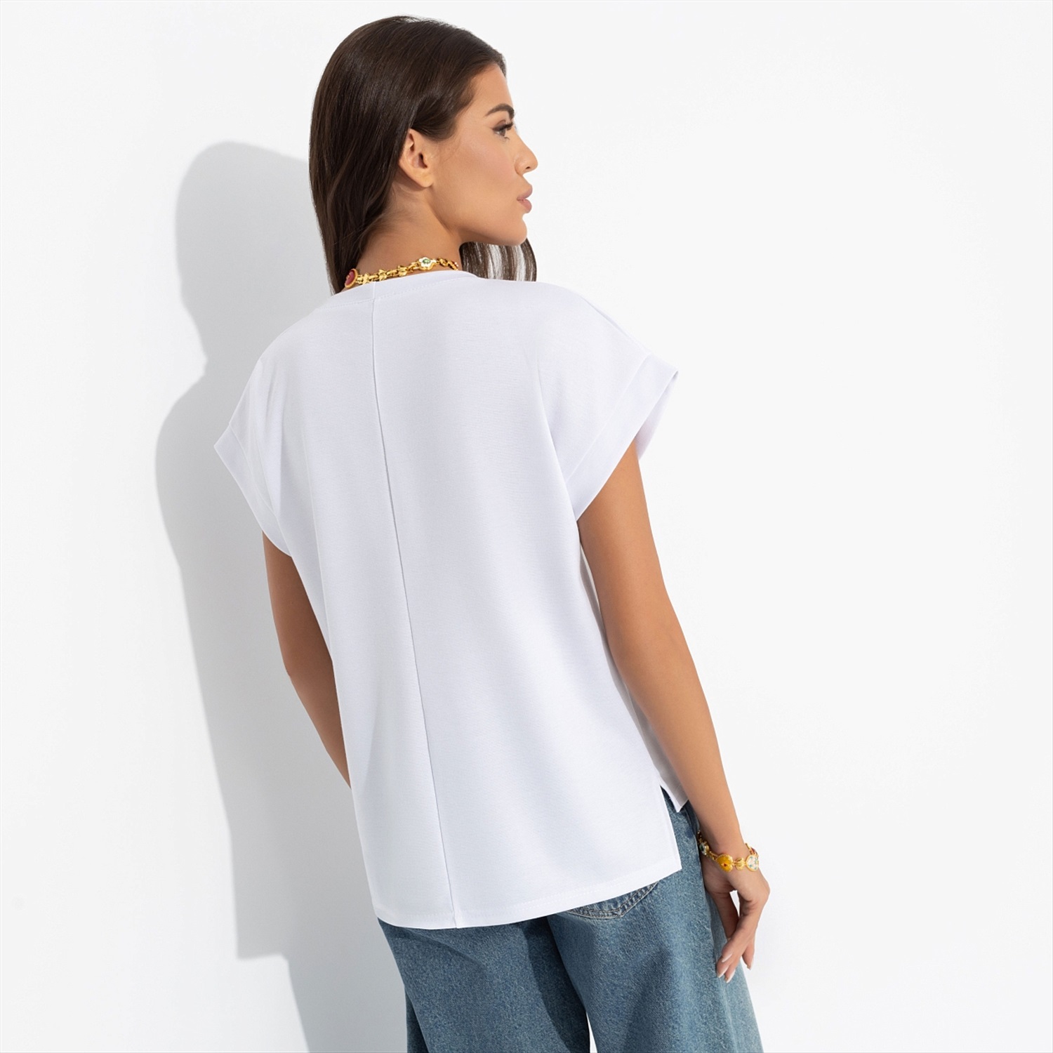ТН ВЭД: 6109902000; Состав: «Милано» (65% п/э, 30% вискоза, 5% стрейч); Плотность ткани: Средняя; Тип ткани: Трикотаж; Вид застежки: Нет; Карманы: Нет; Основной цвет ткани: Белый; Отрезная талия: Нет; Подклад: Нет; Резинка по талии: Нет; Рисунок/раппорт: Каждое изделие уникально из-за расположения рисунка на ткани; Сезон: Круглогодичный; Силуэт: Прямой; Стиль: Повседневный