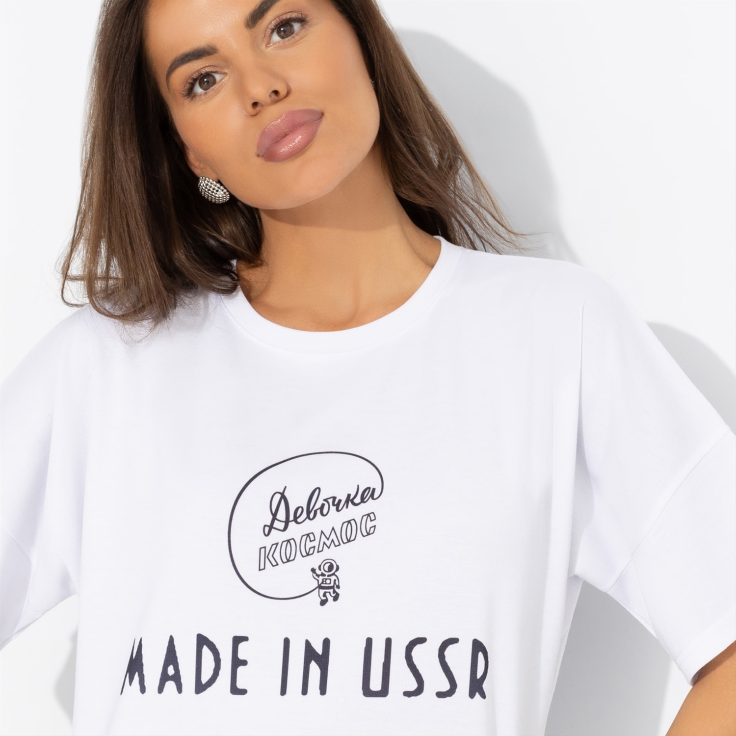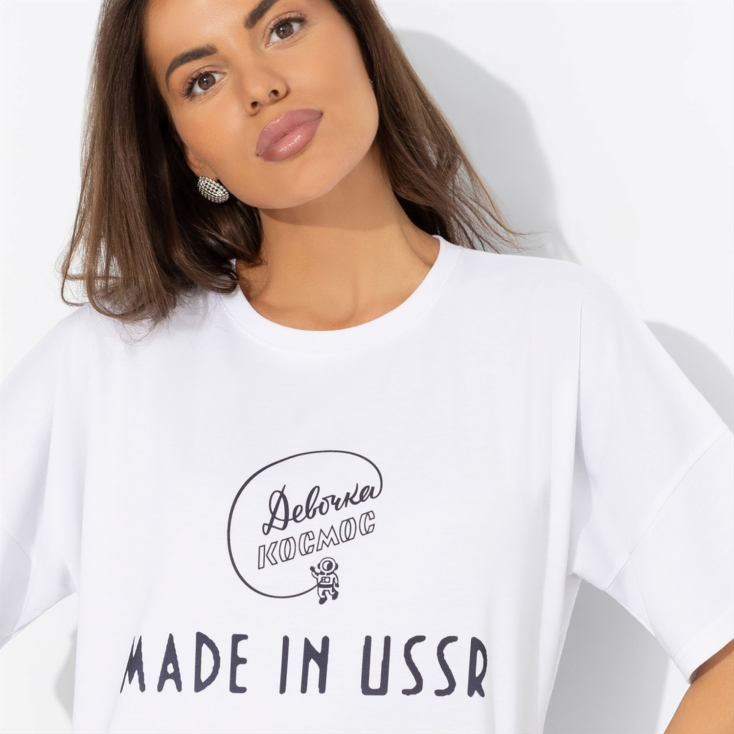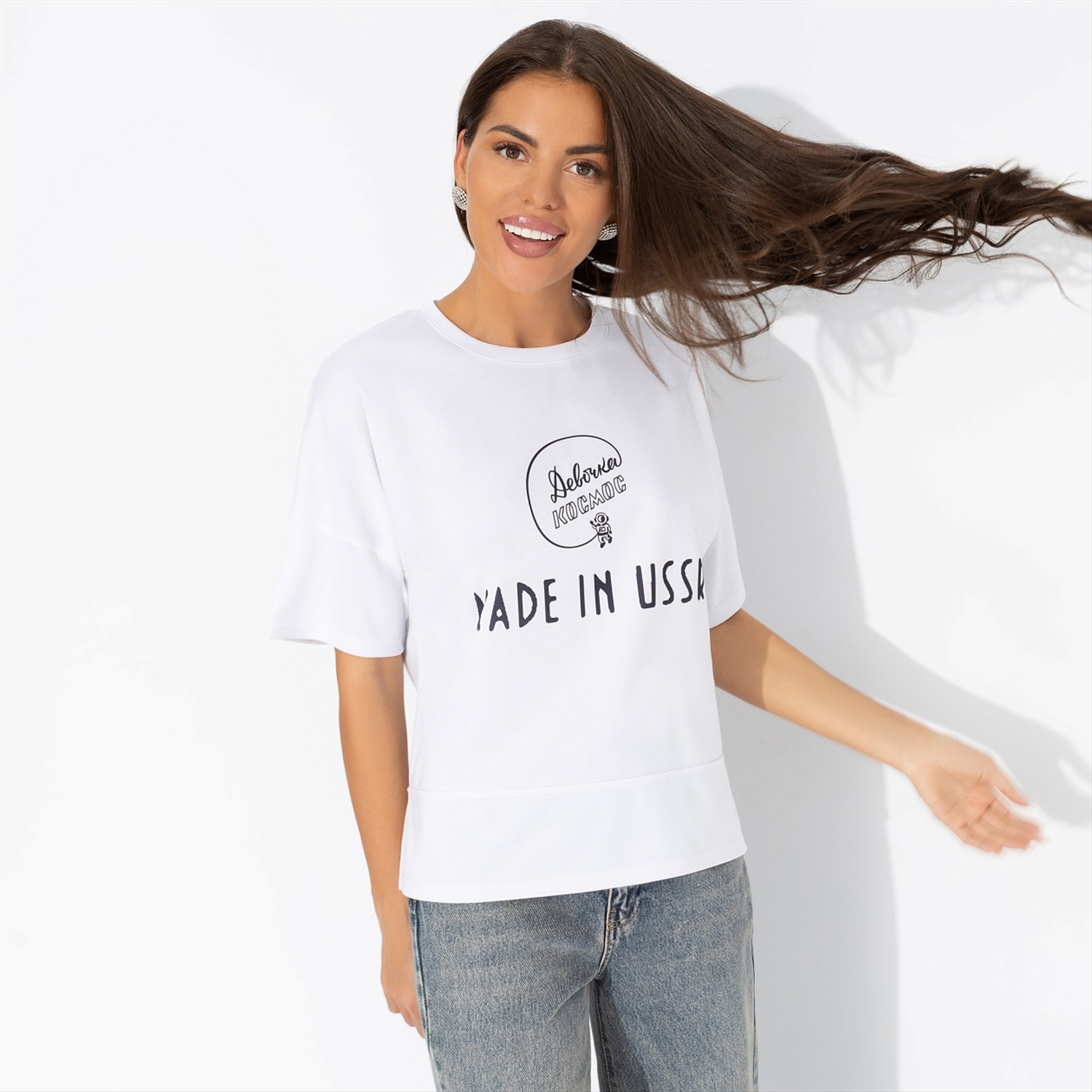 ТН ВЭД: 6109909000; Состав: «Милано» (65% п/э, 30% вискоза, 5% стрейч); Плотность ткани: Средняя; Тип ткани: Трикотаж; Вид застежки: Нет; Декоративные элементы: Другое; Дополнительный цвет ткани: Черный; Карманы: Нет; Основной цвет ткани: Белый; Отрезная талия: Есть; Подклад: Нет; Резинка по талии: Нет; Рисунок/раппорт: Каждое изделие уникально из-за расположения рисунка на ткани; Сезон: Круглогодичный; Силуэт: Прямой; Стиль: Повседневный