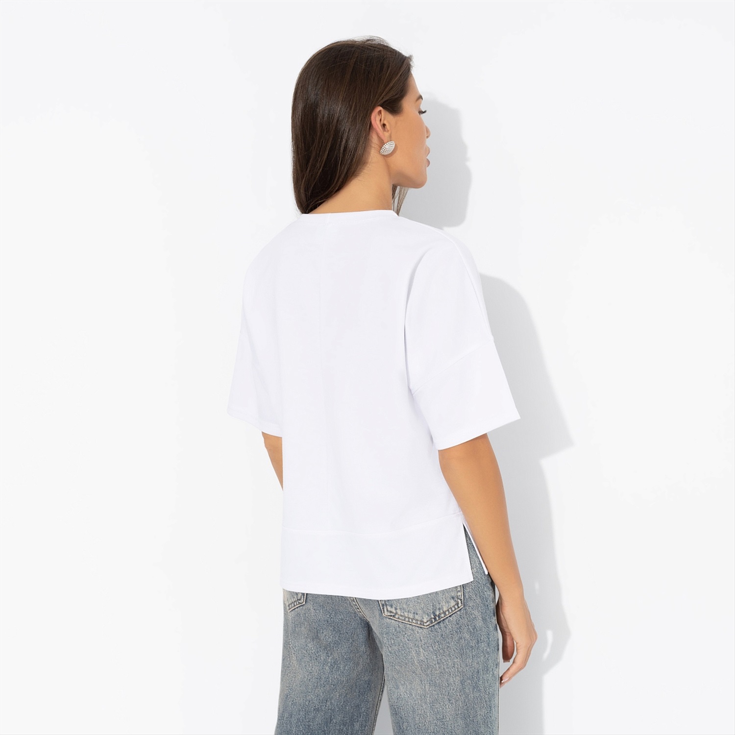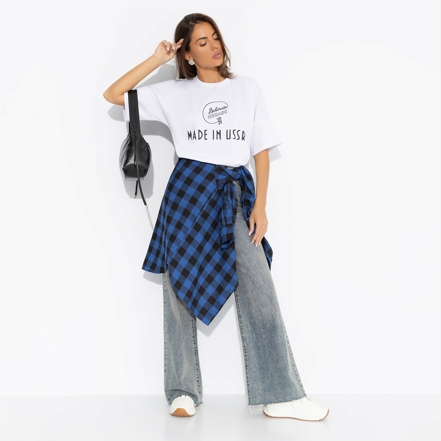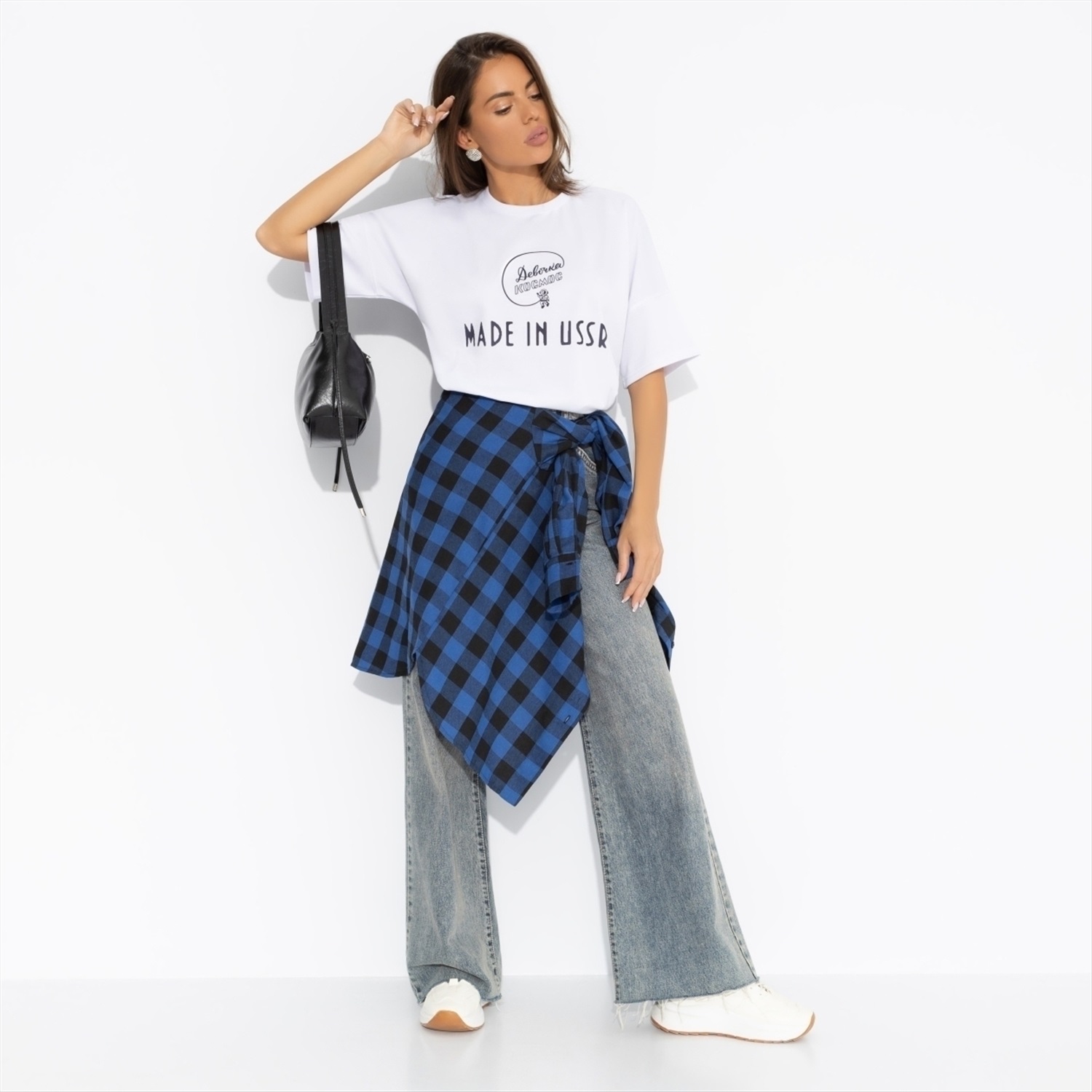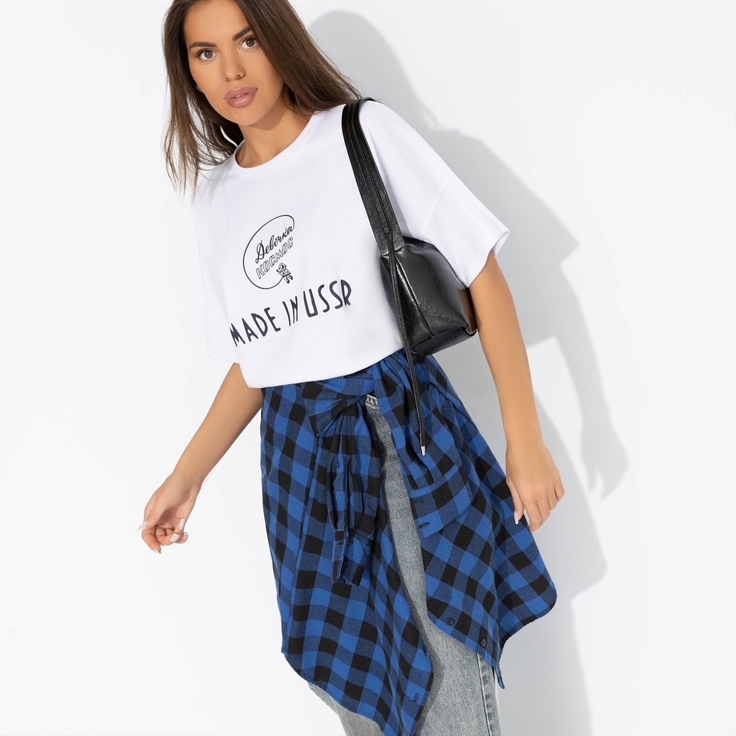 ТН ВЭД: 6109909000; Состав: «Милано» (65% п/э, 30% вискоза, 5% стрейч); Плотность ткани: Средняя; Тип ткани: Трикотаж; Вид застежки: Нет; Декоративные элементы: Другое; Дополнительный цвет ткани: Черный; Карманы: Нет; Основной цвет ткани: Белый; Отрезная талия: Есть; Подклад: Нет; Резинка по талии: Нет; Рисунок/раппорт: Каждое изделие уникально из-за расположения рисунка на ткани; Сезон: Круглогодичный; Силуэт: Прямой; Стиль: Повседневный