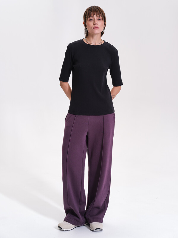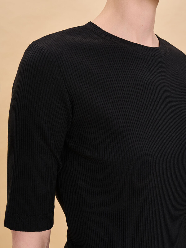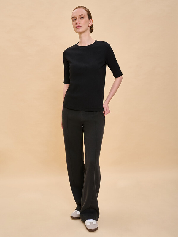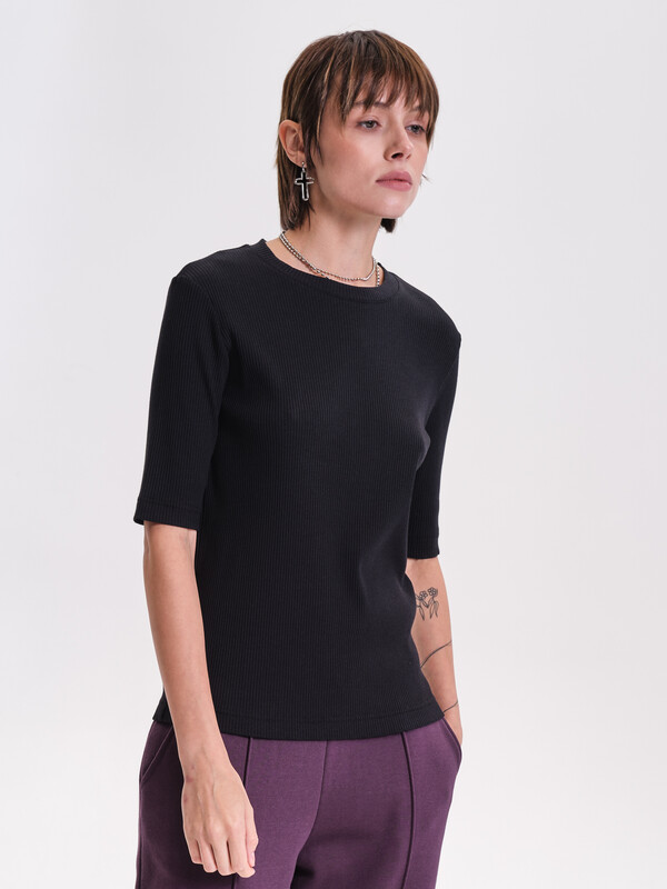 Футболка однотонная женская. Комфортная мягкая майка небольшого объёма станет отличным дополнением вашего повседневного гардероба. Модель выполнена из эластичной рибаны (ткань в рубчик), вырез горловины также обработан рибаной — она прекрасно держит форму, не растягивается, при этом футболку удобно надевать и снимать. Базовая футболка с рукавом длиной до локтя — актуальный тренд сезона. Изделие неприхотливо в уходе. Модель лаконичного дизайна, без принта. В составе ткани преобладают высококачественный хлопок и  вискоза — майка мягкая, дышащая, приятная на ощупь. Эластан помогает сохранить первоначальную форму в течение длительного времени. Однотонная футболка выполнена в универсальных цветах, её легко комбинировать с различными брюками, шортами, юбками. Футболка женская без принта — базовый элемент гардероба, пригодится в любой ситуации. Однотонная футболка женская подходит для любого времени года, её можно носить как летом, так и в холодное время года в качестве среднего слоя одежды, а также на спорт. Помните о правильном уходе за изделием: рекомендуется стирать при температуре не выше 30 °C, без предварительного замачивания, с изнанки. Это поможет сохранить качество и цвет футболки на длительное время.