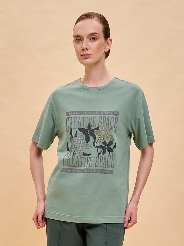 Женская футболка с принтом среднего объёма с коротким прямым рукавом. Вырез горловины обработан окантовкой. Изделие неприхотливо в уходе. Хлопковая футболка женская украшена принтом + актуальной аппликацией из мелких страз. Шрифты в трендовом университском стиле + цветы. Надписи переводятся: «креативное пространство», «я отрицаю вашу реальность и создаю свою собственную!». Принт и аппликация устойчивые, прочные, хорошо переносят многочисленные стирки. В составе ткани преобладает высококачественный хлопок — майка мягкая, воздухопроницаемая, приятная на ощупь. Футболка с надписями выполнена в трендовых и при этом универсальных цветах, которые отлично сочетаются с различными брюками, шортами. Футболки с принтом женские подходят также девушкам, девочкам-подросткам. Хлопковая футболка идеальна для любого времени года, её можно носить как летом, так и в холодное время года в качестве среднего слоя одежды, а также на спорт. Помните о правильном уходе за изделием: рекомендуется стирать при температуре не выше 30 °C, без предварительного замачивания, с изнанки. Это поможет сохранить качество и цвет футболки на длительное время.