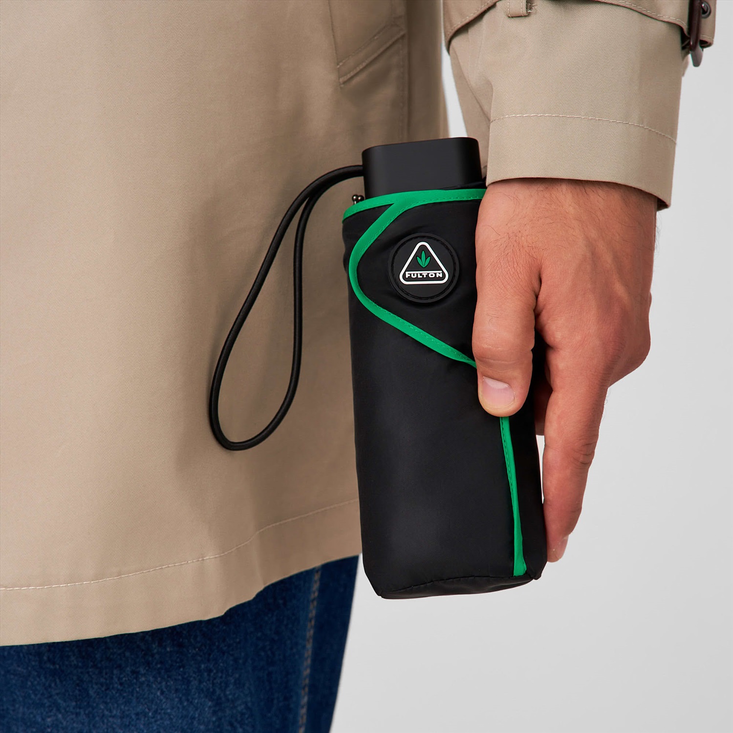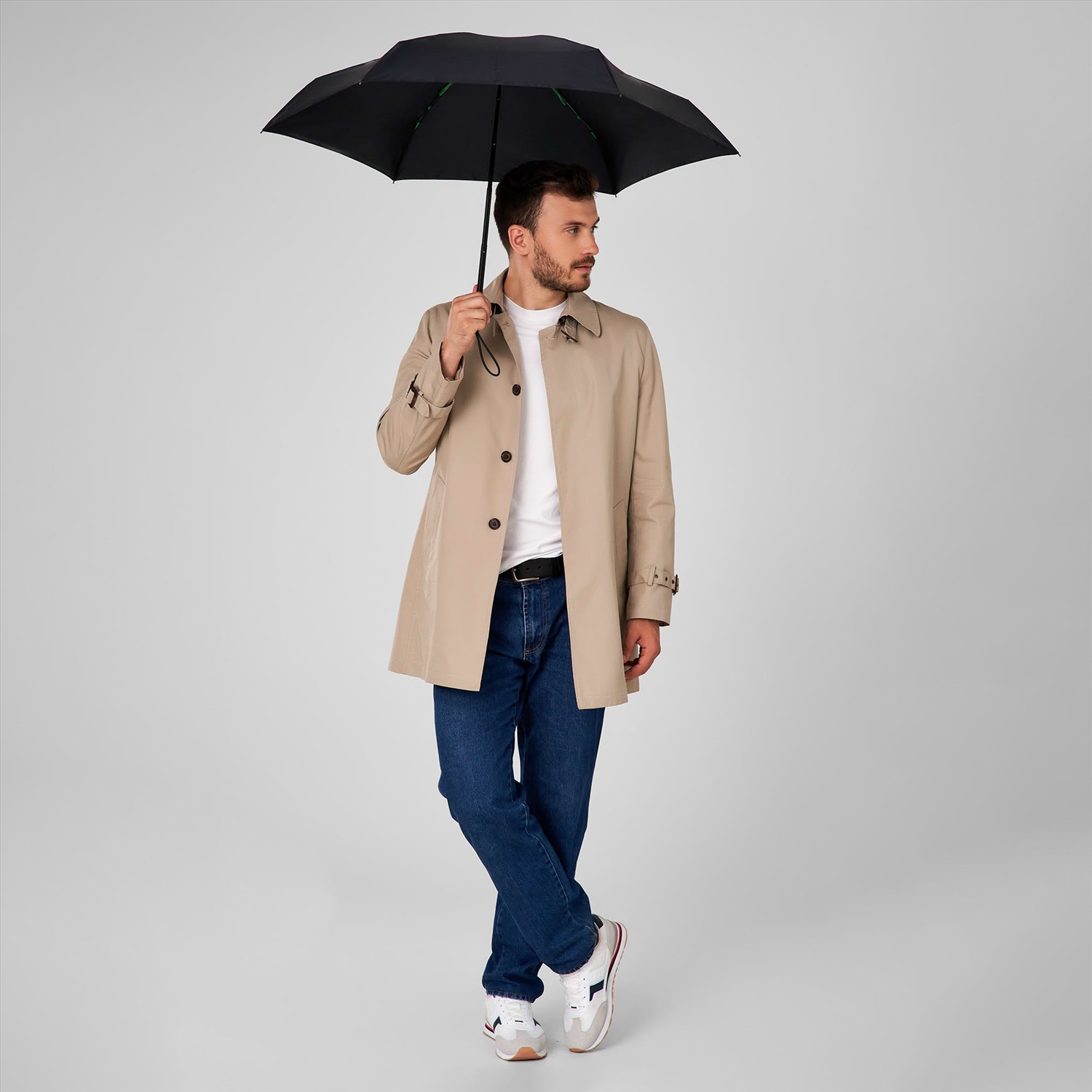 Отличный мужской зонт особого назначения, готовый к защите владельца в условиях ураганной погоды. На суперветроустойчивую готовность зонта прямо указывают элементы конструкции зеленого цвета, они выполнены из поликарбоната. Спицы зонта также дополнительно усилены. Зонт достаточно легкий благодаря отсутствию автоматического механизма.