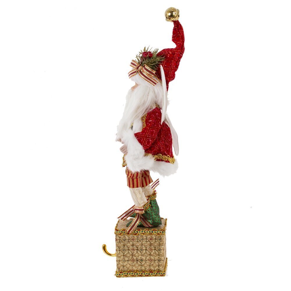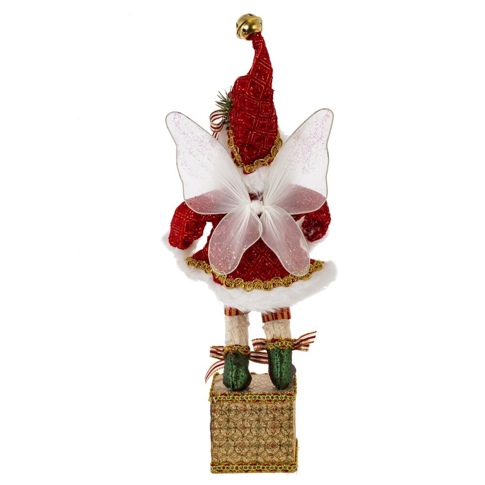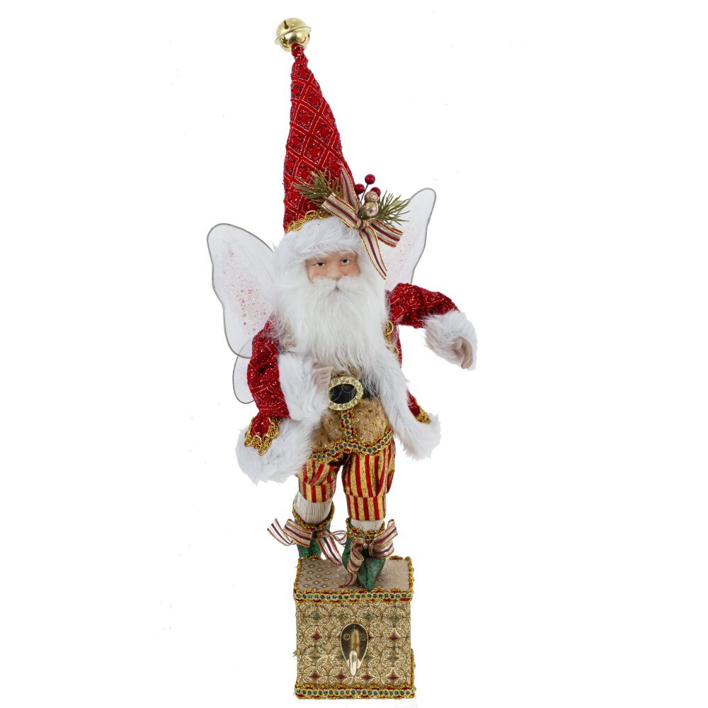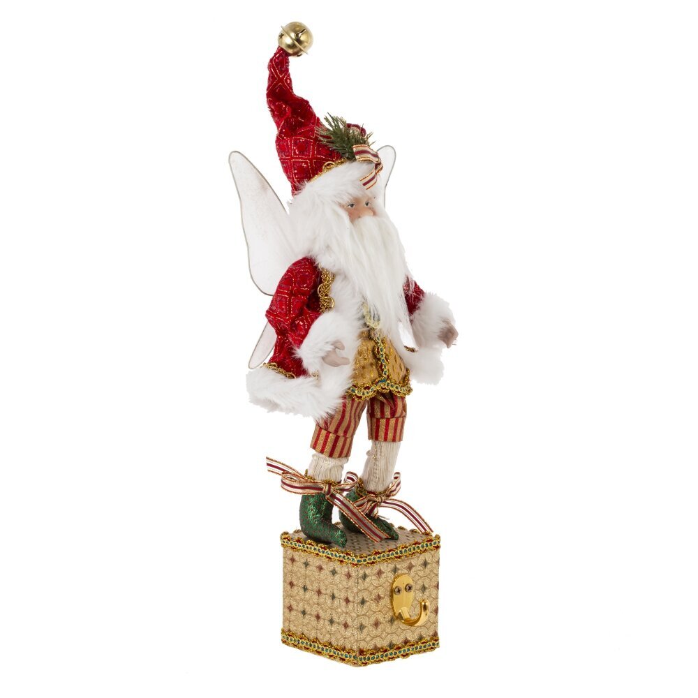 Декоративная игрушка "Дед Мороз-эльф" - прекрасное дополнение к новогоднему интерьеру. Этот персонаж выглядит как эльф с крылышками в красном костюме Санты с колпаком, стоящий на золотой подставке с крючком для подвешивания носка. Реалистичные лицо и руки, выполненные из полимерных материалов, придают особый шарм этой игрушке. Он наполняет пространство таинственным и праздничным настроением.