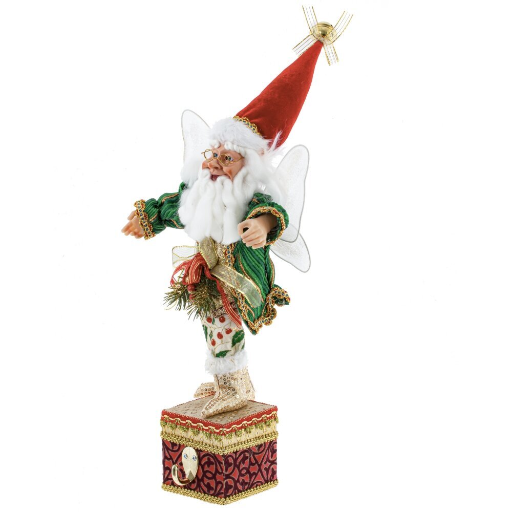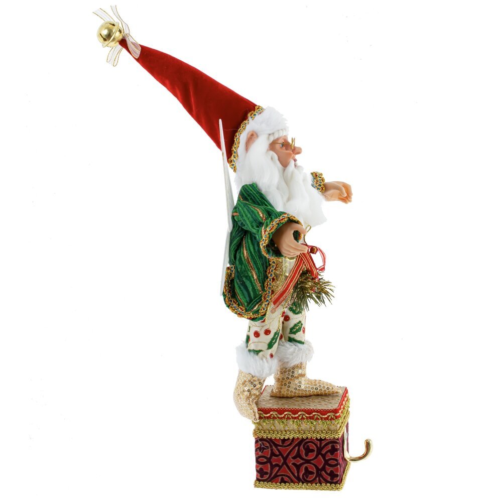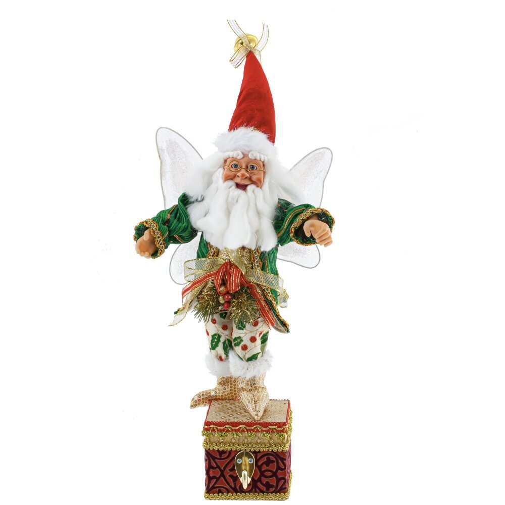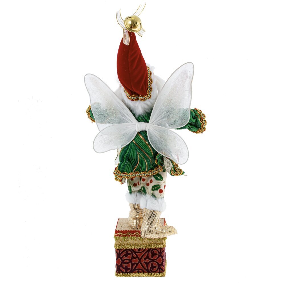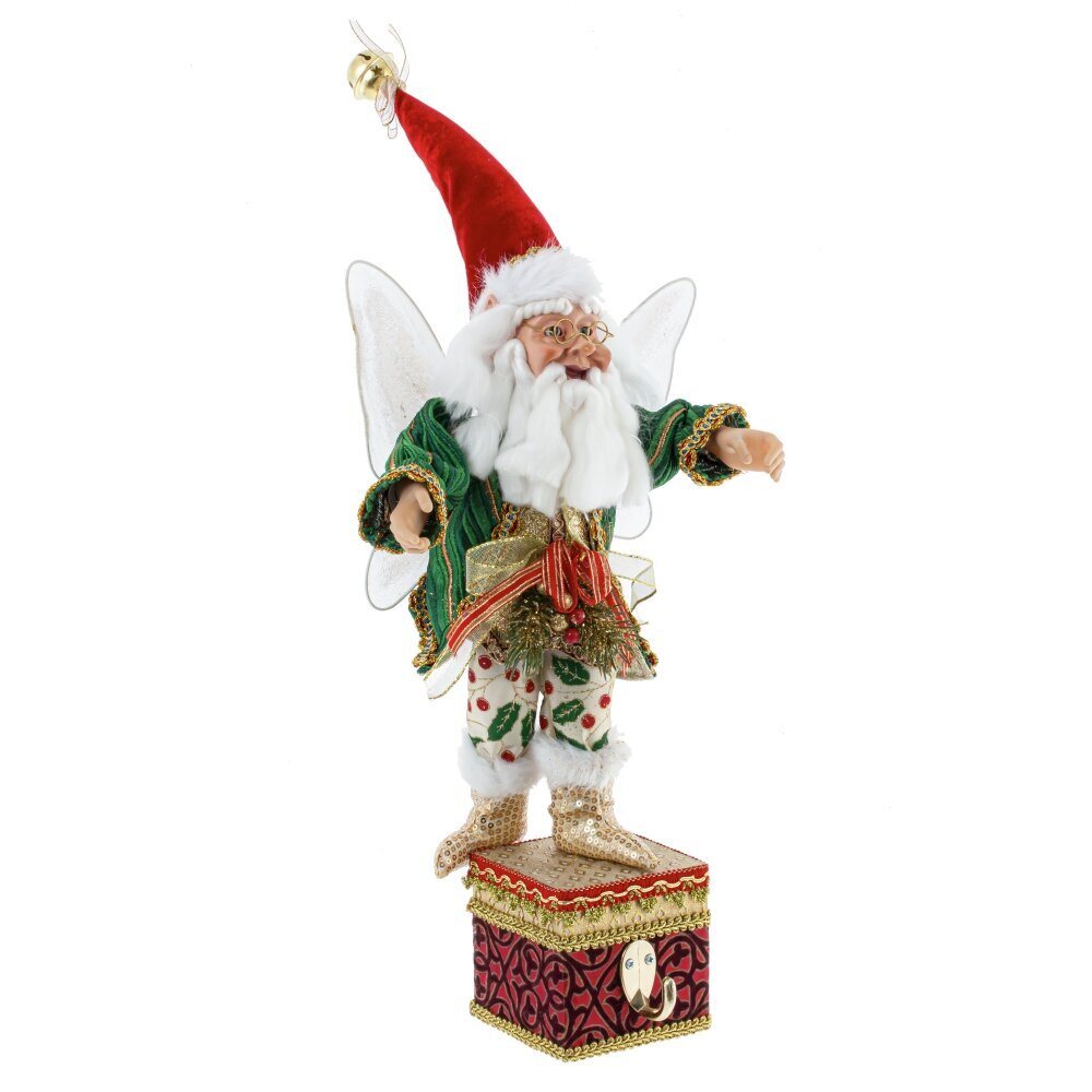 Декоративная игрушка "Дед Мороз-эльф" - прекрасное дополнение к новогоднему интерьеру. Этот персонаж выглядит как эльф с крылышками в зеленом костюме Санты с красным колпаком, стоящий на подставке с крючком для подвешивания носка. Реалистичные лицо и руки, выполненные из полимерных материалов, придают особый шарм этой игрушке. Он наполняет пространство таинственным и праздничным настроением.