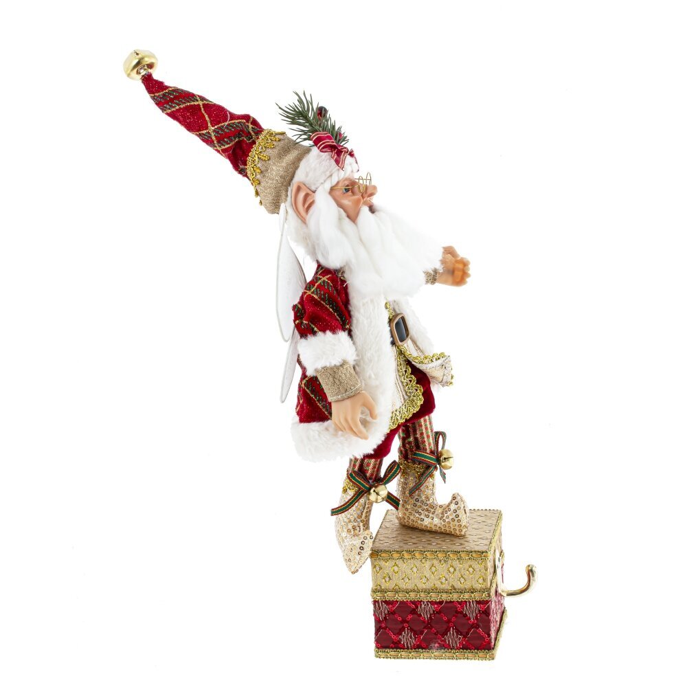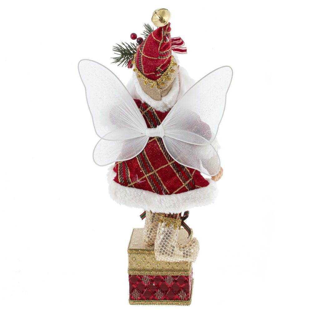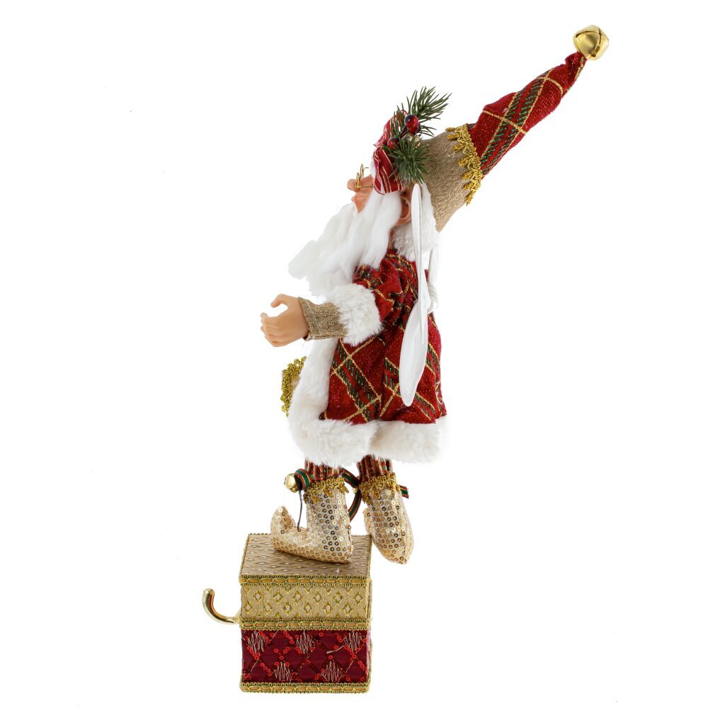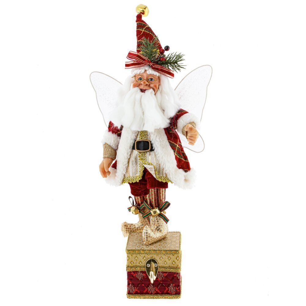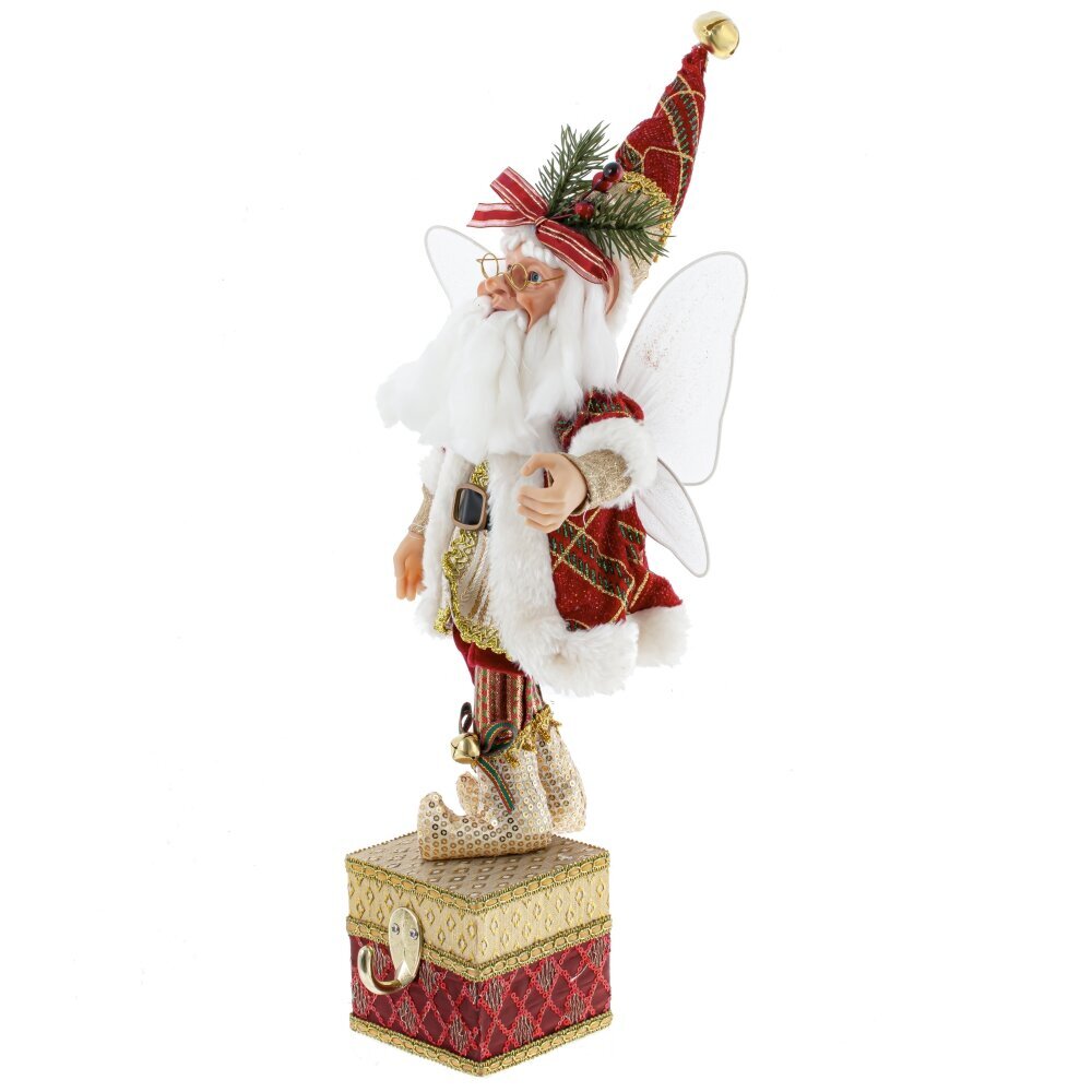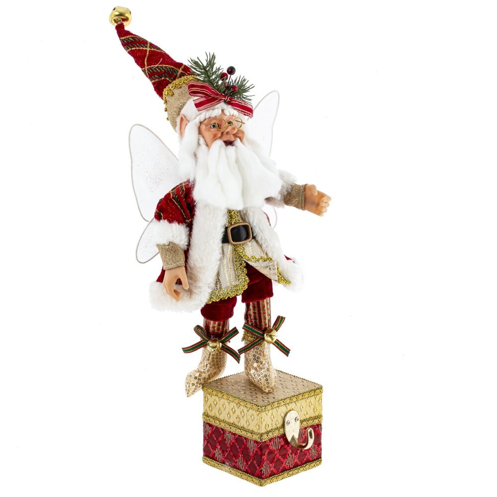 Декоративная игрушка "Дед Мороз-эльф" - прекрасное дополнение к новогоднему интерьеру. Этот персонаж выглядит как эльф с крылышками в красном костюме Санты с колпаком, стоящий на подставке с крючком для подвешивания носка. Реалистичные лицо и руки, выполненные из полимерных материалов, придают особый шарм этой игрушке. Он наполняет пространство таинственным и праздничным настроением.