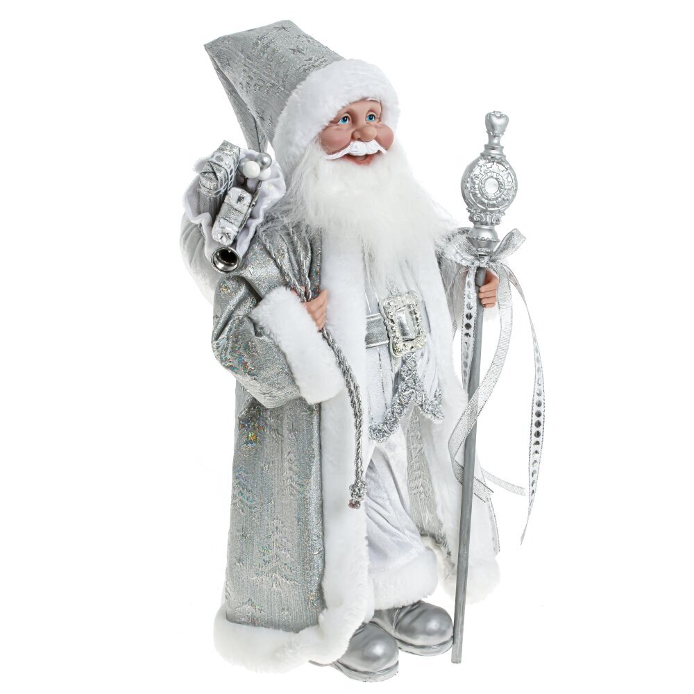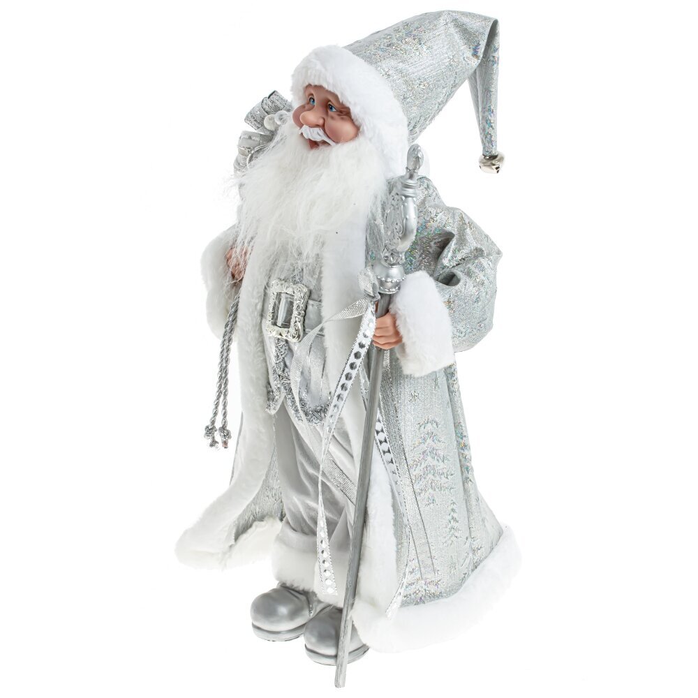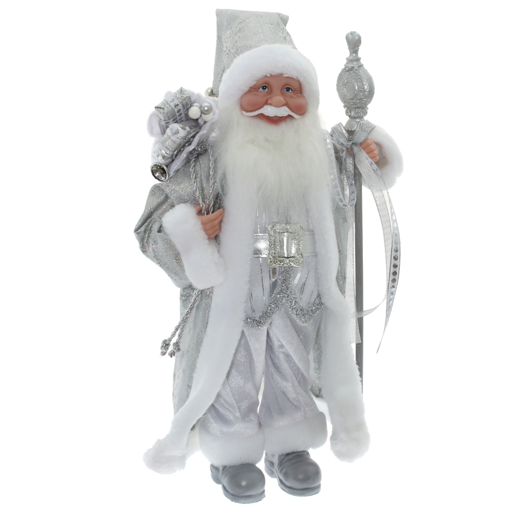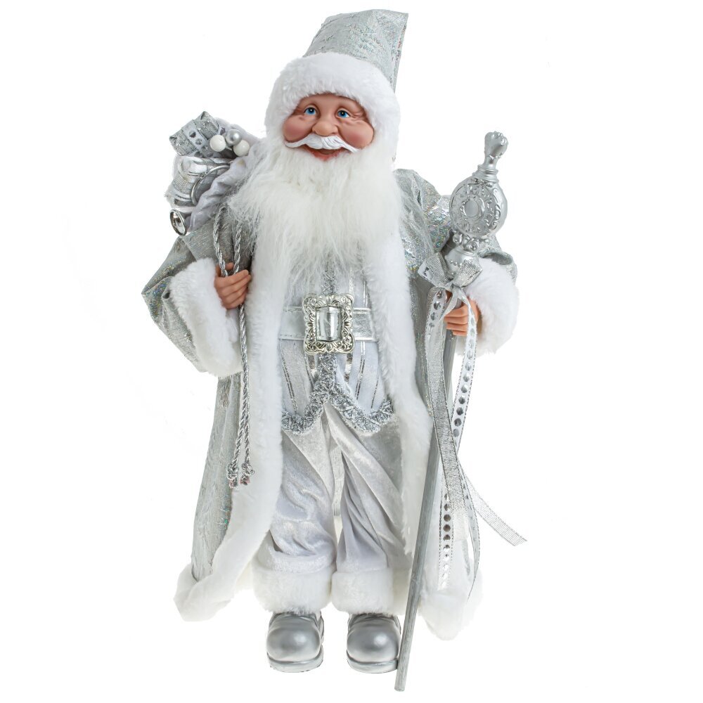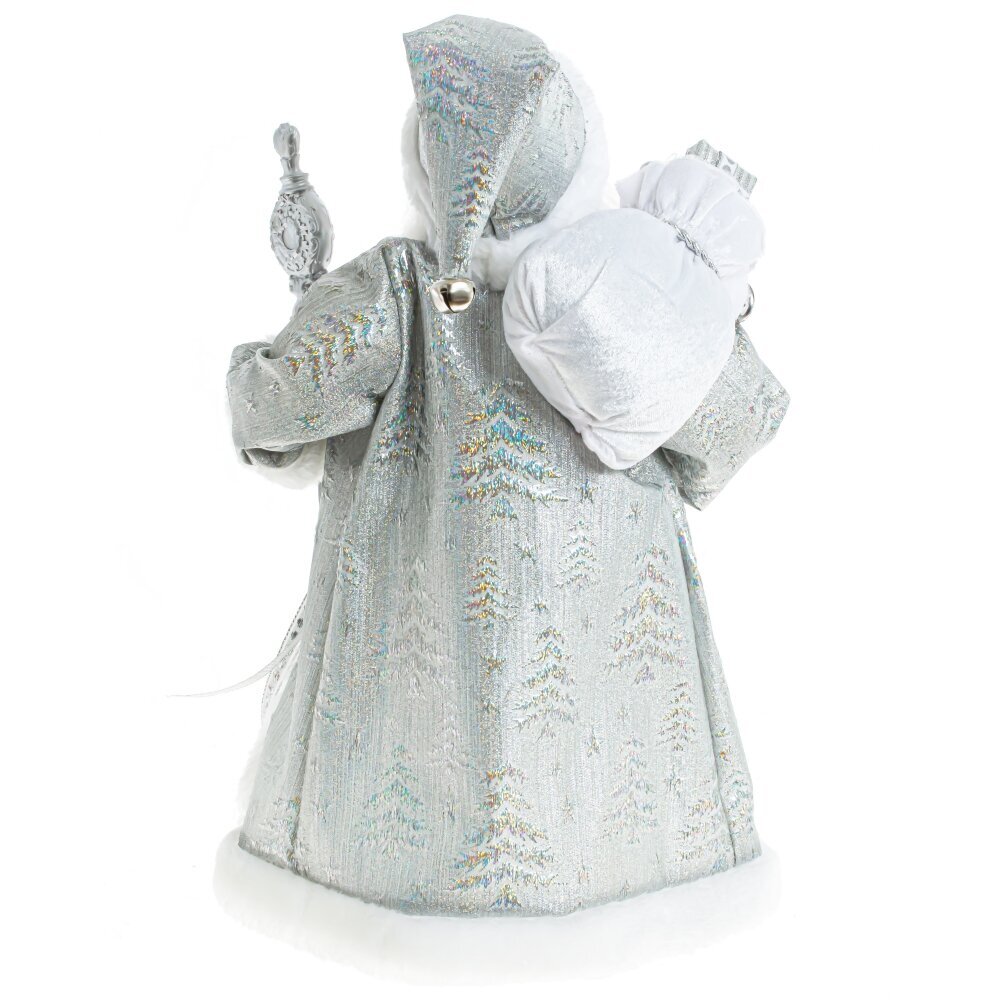 Дед Мороз с волшебным посохом и мешком подарков. Очень нарядная, богато украшенная шуба и большая белая борода придают Деду Морозу величавый внешний вид.