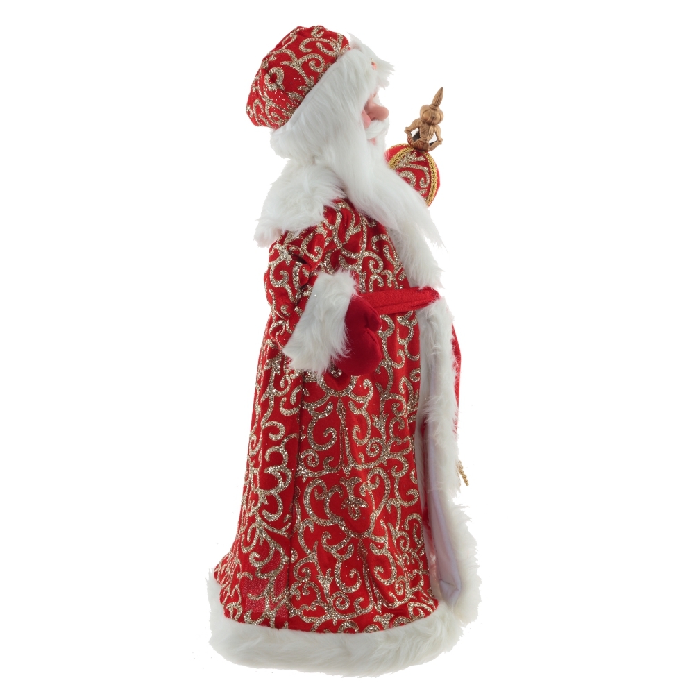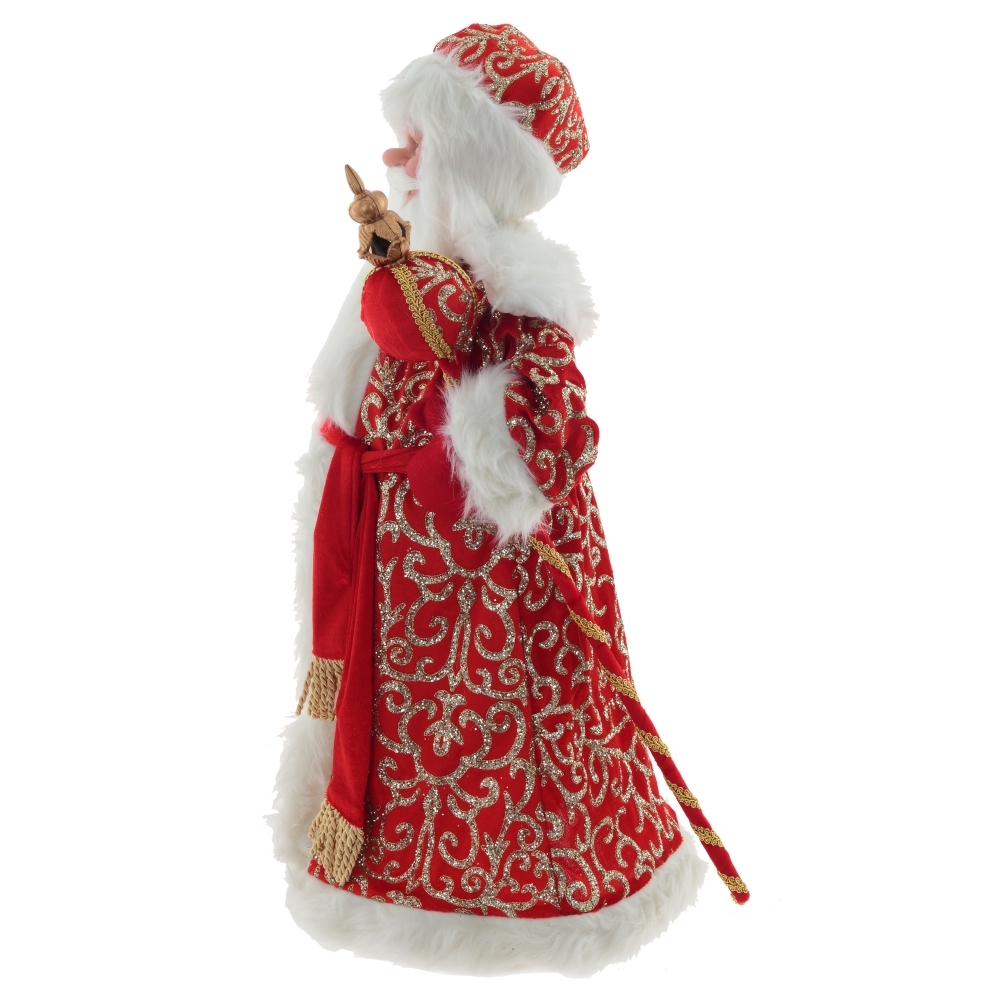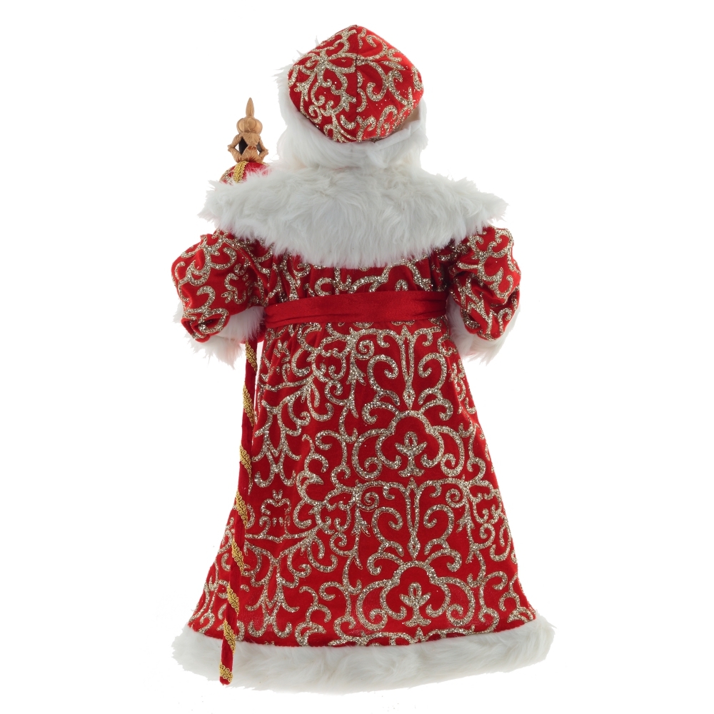 Дед Мороз с волшебным посохом и мешком подарков. Очень нарядная, богато украшенная шуба и большая белая борода придают Деду Морозу величавый внешний вид.