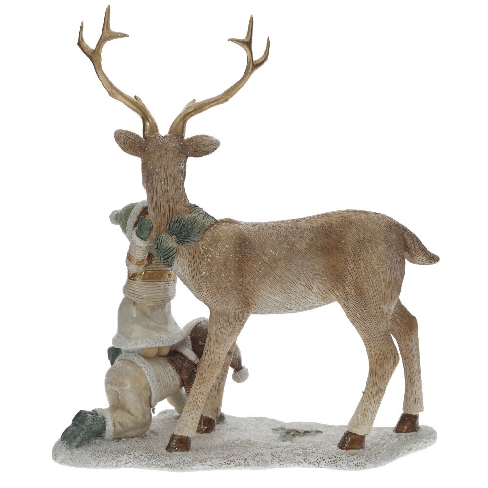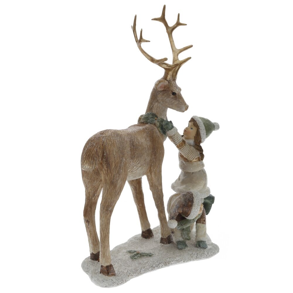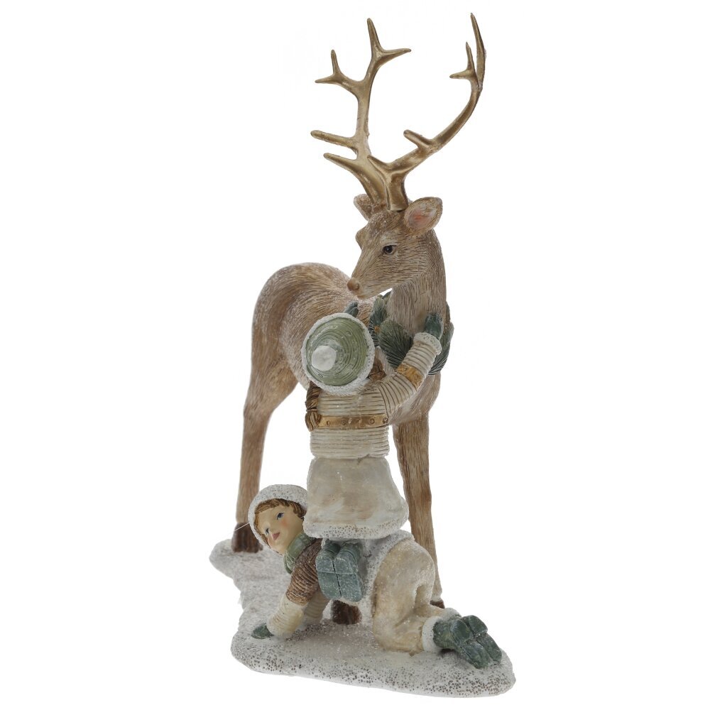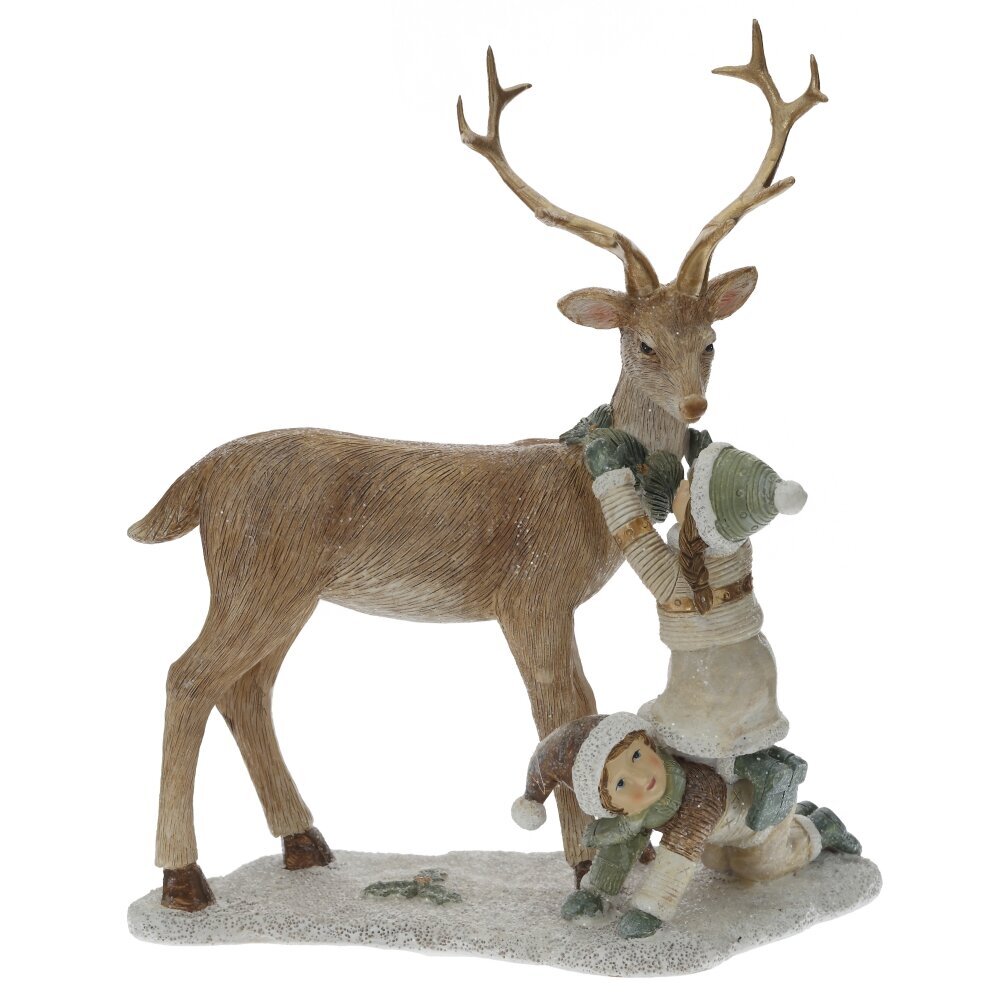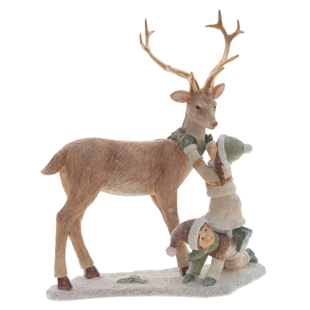 Декоративная фигурка "Олень и дети" из полистоуна наполнена теплом и радостью. Она изображает трогательную сцену, где мальчик и девочка играют с милым лесным оленем. Мальчик подставил девочке свою спину, чтобы она завязала на шее оленя венок. Высокая детализация делает фигурку идеальным украшением интерьера к новогодним праздникам, добавляя в дом атмосферу уюта и волшебства.