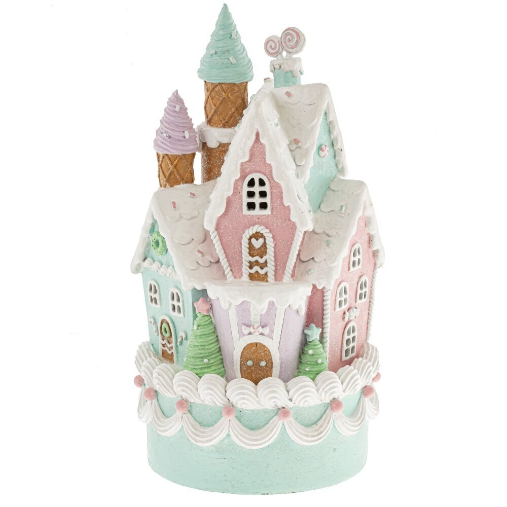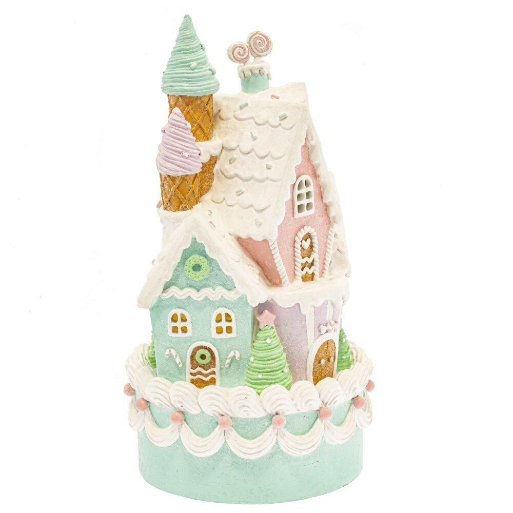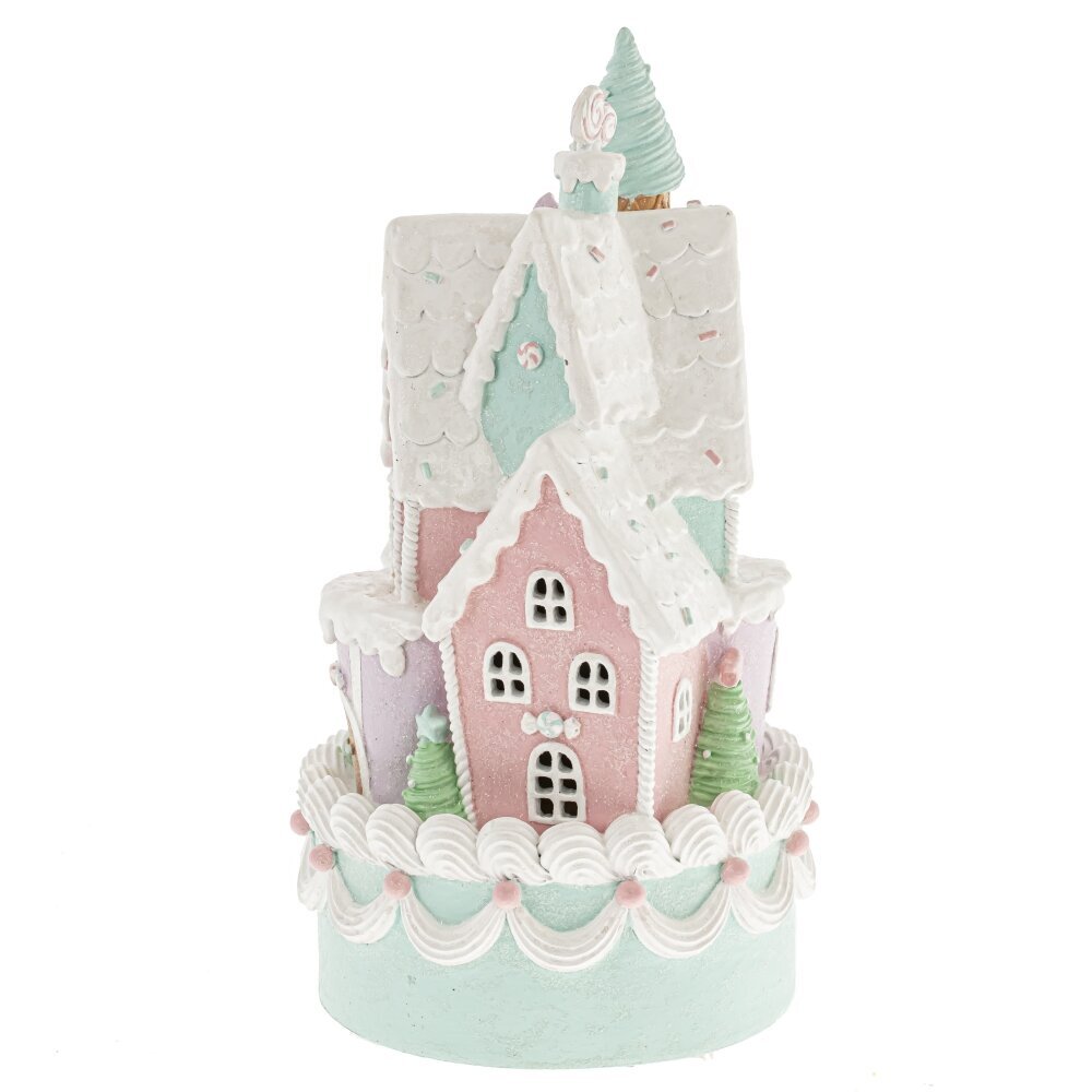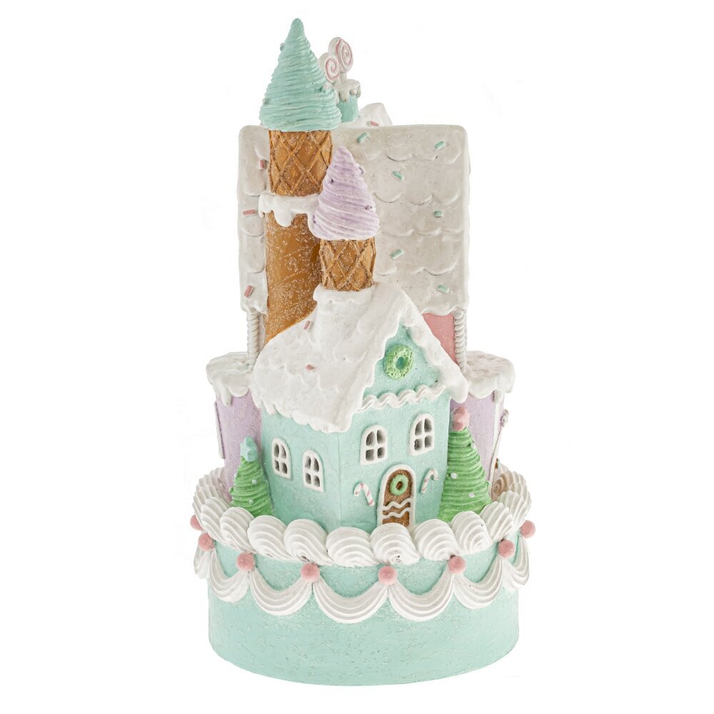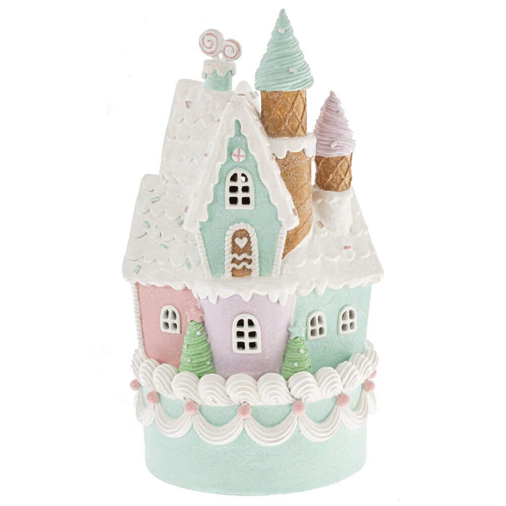 Фигурка “Домик-торт” - это волшебное украшение, выполненное из полимерной глины в форме пряничного торта-замка. Он эффектно украшен розово-бирюзовой “глазурью” и посыпан снежным глиттером, придающим мерцающий блеск. Рычажок на дне фигурки активирует подсветку, и из окон домика горит свет, словно оживает сказочная история. Для работы необходимы две батарейки типа AA (не прилагаются). Это декоративное чудо будет отлично смотреться на сладком праздничном столе, добавляя в атмосферу дома уют и сказочное настроение.