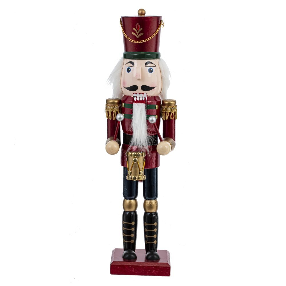 Фигурка декоративная "Щелкунчик" станет ярким акцентом в вашем новогоднем декоре! Аккуратно выполненная из дерева, она привносит атмосферу праздника и волшебства. Бравый Щелкунчик в ярком мундире и кивере, украшенном цепочкой, стоит на небольшой квадратной подставке. Его борода и волосы выполнены из искусственного меха, что придает фигурке невероятную реалистичность. Уникальный элемент – рычаг на спине, который открывает и закрывает рот. Великолепный выбор для создания праздничного настроения!