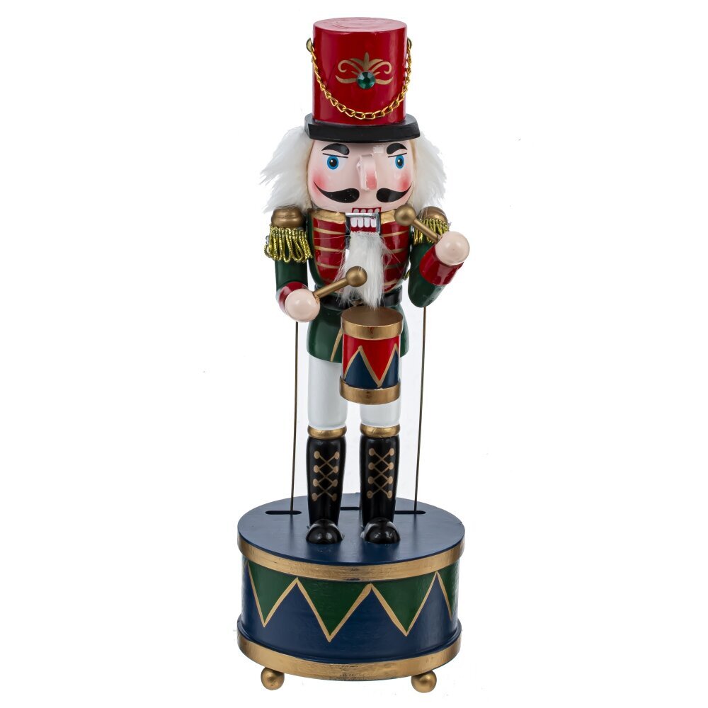 Декоративный деревянный Щелкунчик с музыкой на заводном ключе и функцией движения. Стоит на деревянной подставке в форме барабана. При повороте ключа Щелкунчик начинает двигать руками и открывать-закрывать рот под мелодию из одноименного балета. Этот очаровательный щелкунчик станет отличным украшением для вашего дома и принесет в него праздничное настроение и волшебную атмосферу сказки.