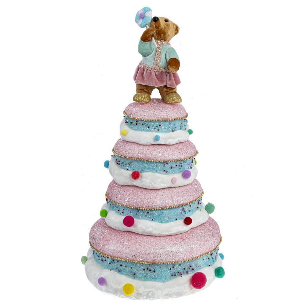Декоративная фигурка "Торт" — это яркое и интересное украшение, которое станет прекрасным акцентом в любом интерьере. Размеры фигуры составляют 25 см в длину, 25 см в ширину и 49 см в высоту, что делает её заметной и эффектной. Торт представлен в виде многослойной конструкции, где каждый ярус выполнен в пастельных тонах, таких как розовый и голубой. Поверхности слоёв украшены блестящей посыпкой и яркими помпонами, добавляющими игривости и праздности. На верхушке торта стоит милая фигурка медведя в нарядном платье, которая держит в руках сладкое угощение. Этот элемент придаёт фигурке дружелюбный и солнечный вид. Этот декоративный элемент отлично подойдёт для новогоднего или праздничного оформления, а также станет замечательным дополнением к детским комнатам или тематическим вечеринкам.