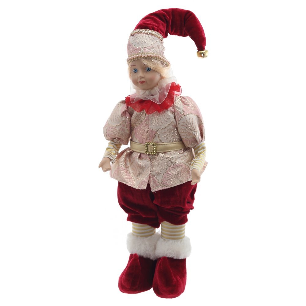 Набивная игрушка «Клоун» — изящная интерьерная кукла с музыкальным и движущимся механизмом. Корпус мягкий, из текстильных материалов; лицо и кисти выполнены из гладкого полимерного материала. Наряд включает бархатные бордовые шаровары и сапожки с белой опушкой, светлый жакет с жаккардовым узором и золотистым пояском, полосатые рукава, красный воротник?жабо и высокий бархатный колпак с бубенчиком. Аккуратная проработка деталей делает образ праздничным и теплым. Идеально для новогоднего декора, коллекции или подарка. Воспроизводит мелодию и сопровождает её плавными движениями. Уход: сухая чистка, беречь от влаги и сильных ударов.