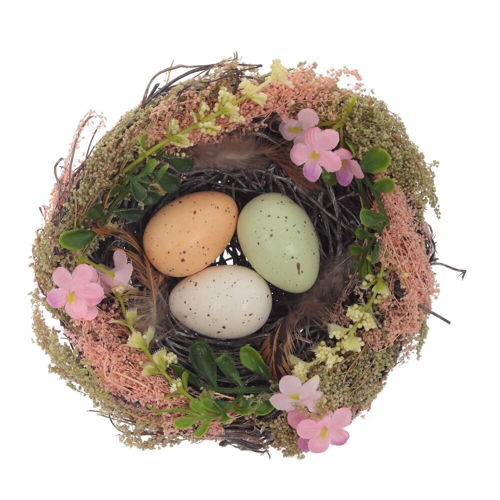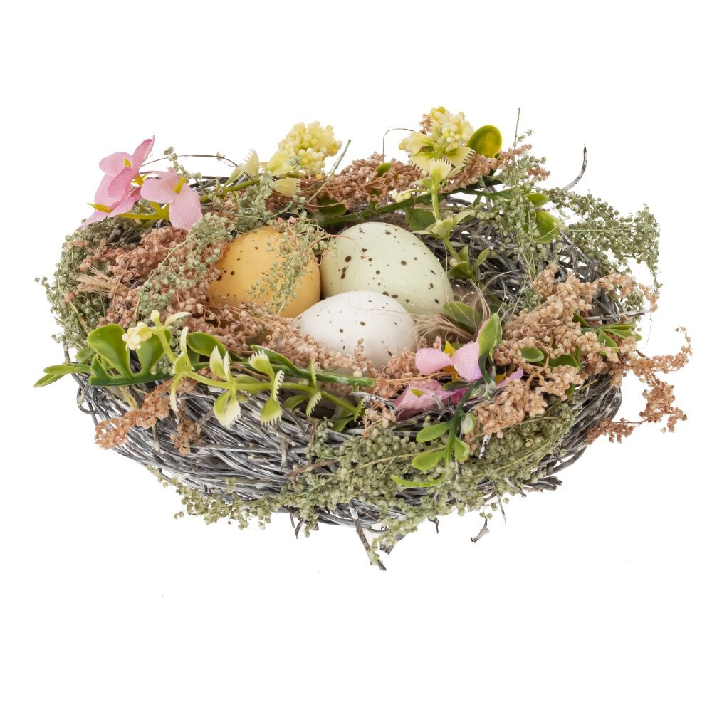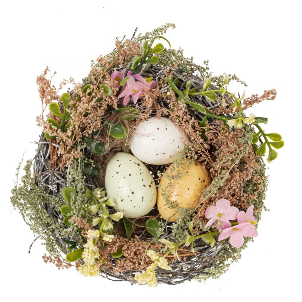 Декоративное "Гнездо пасхальное" – это изделие, которое добавит атмосферу волшебства и радости в ваш дом, создавая неповторимую атмосферу праздника. Главным акцентом являются три яйца, которые расположены внутри. Великолепное сочетание цветов и материалов делает его привлекательным. Используйте изделие в качестве подарка, украшения или элемента декора на пасхальном столе.