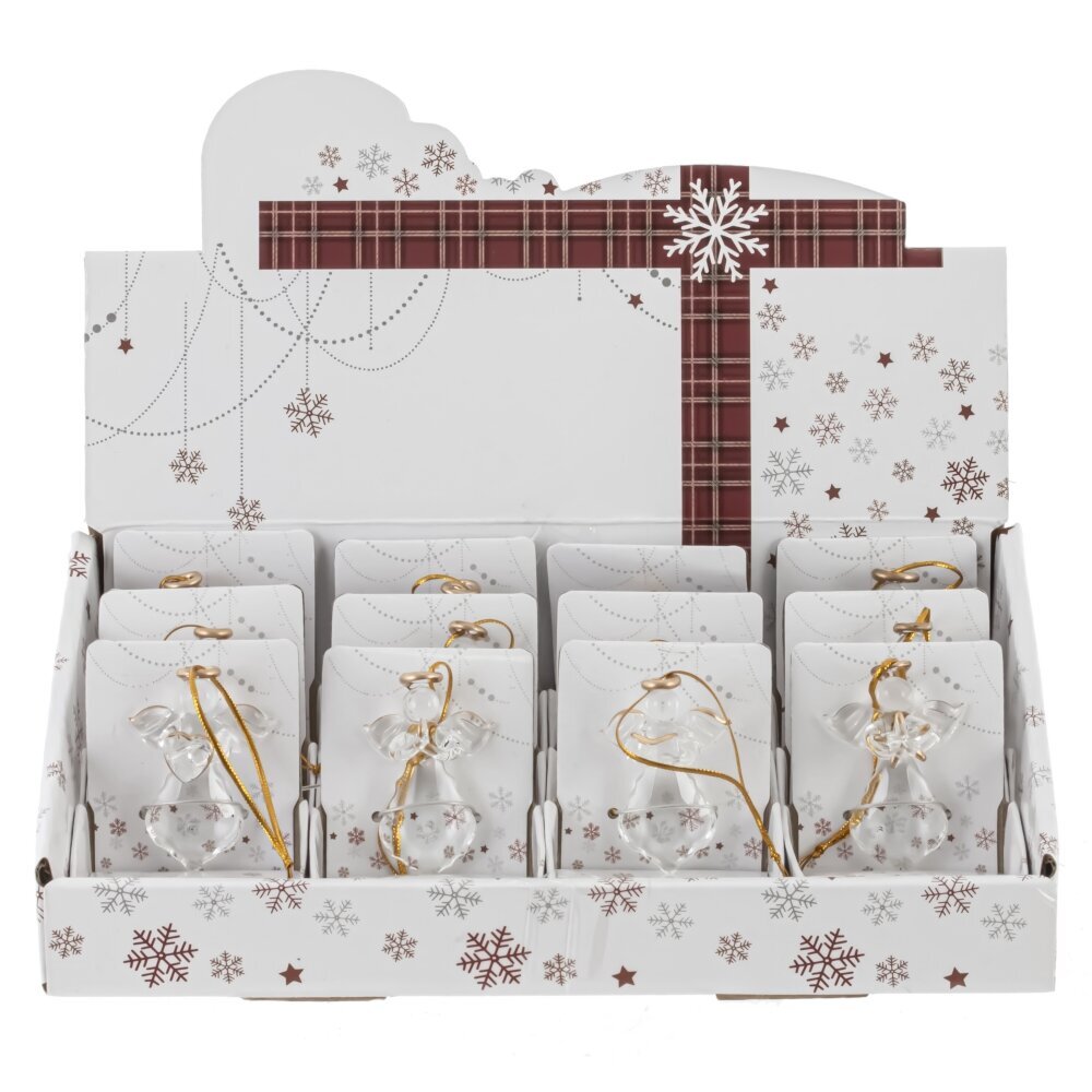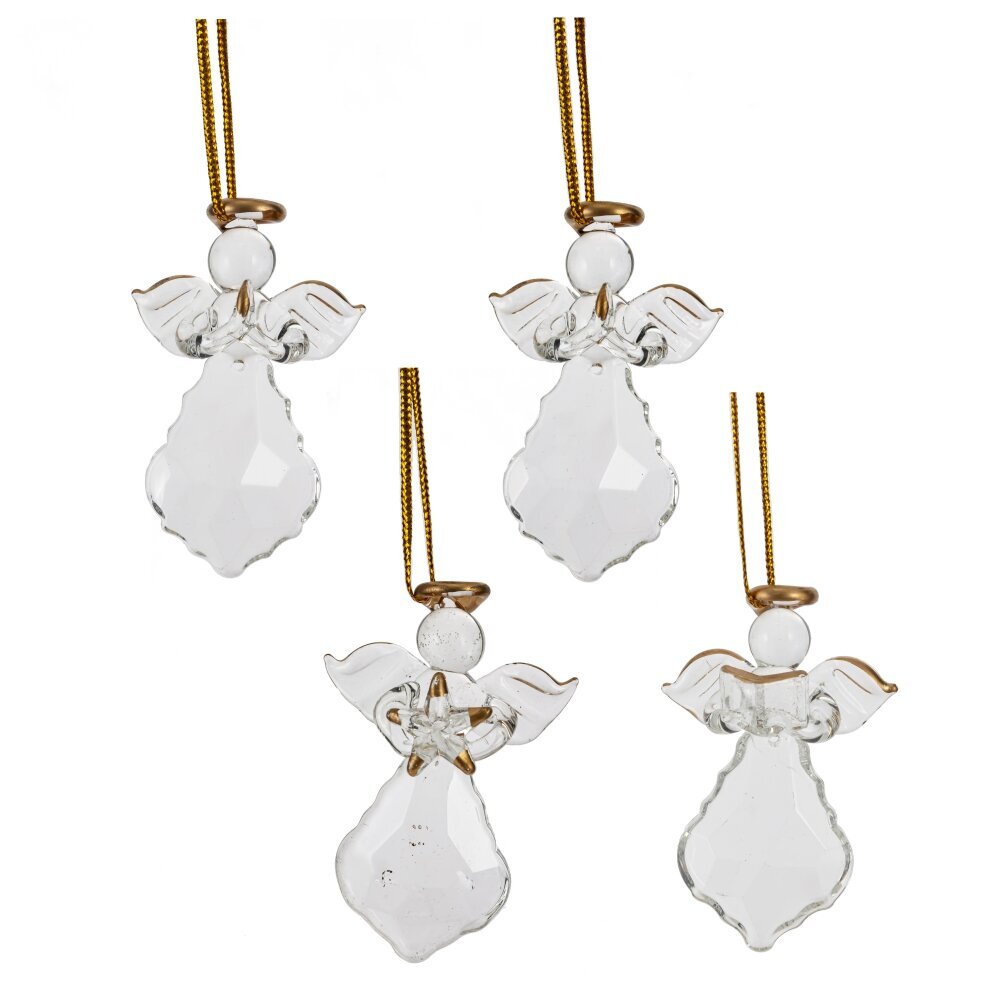 Набор из 12 новогодних украшений «Ангел» — это волшебная коллекция подвесок из прозрачного стекла, каждая из которых сияет хрустальным блеском, дополненным изысканными золотыми элементами, словно посланники небесного света. Эти нежные фигурки ангелов, воплощающие дух Рождества, играют переливами в лучах огней, создавая атмосферу тепла, доброты и праздничного чуда, идеально подходя для украшения ёлки, окон или интерьера.