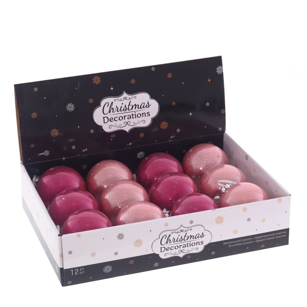Набор из 12-ти шаров для елки в шоу-боксе. Эти новогодние шары из пластика, непременно порадуют вас своим изяществом и прекрасно дополнят праздничный наряд лесной красавицы.