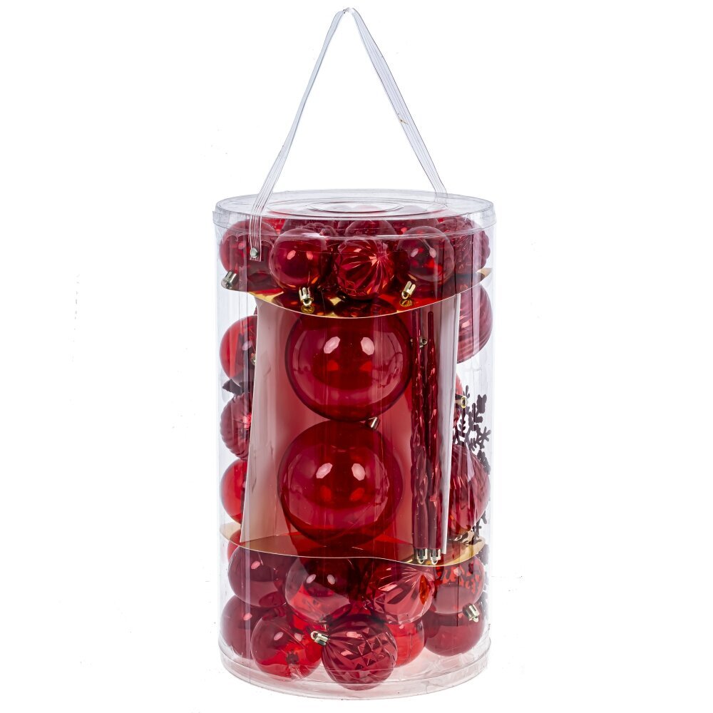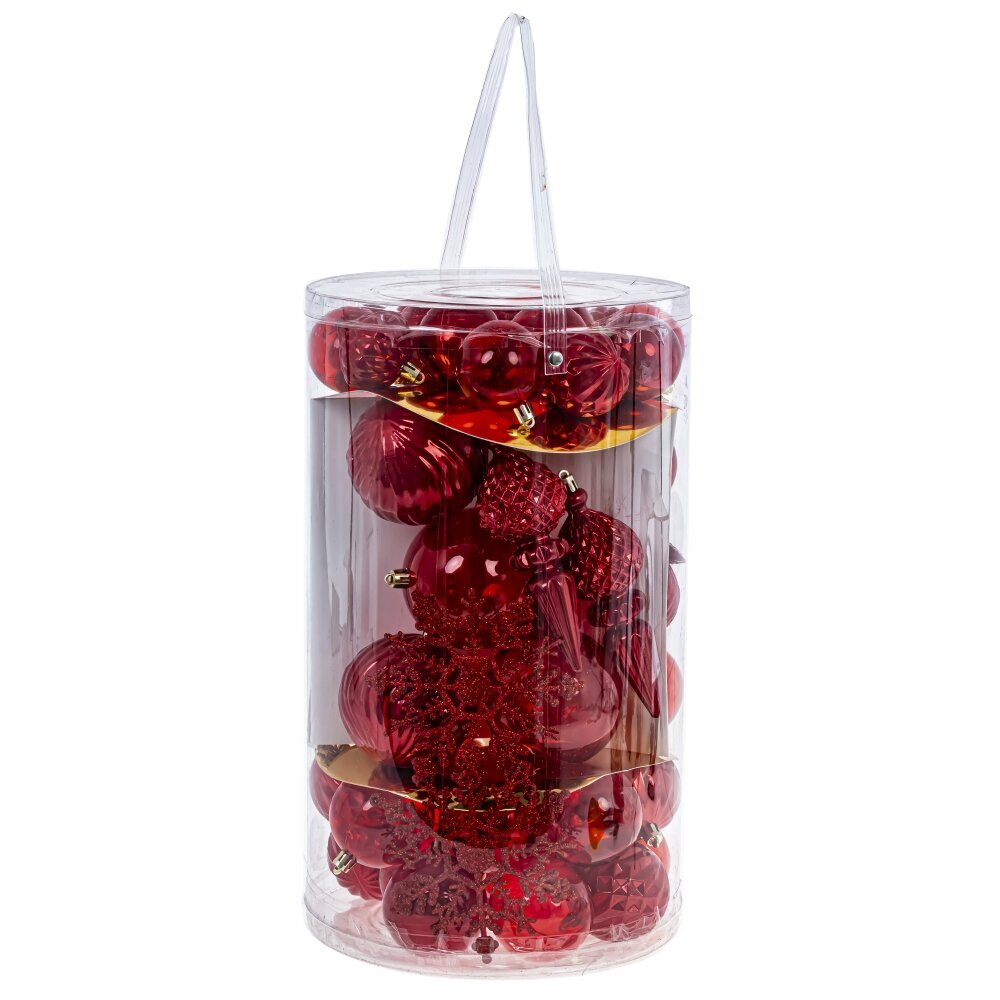 Большой новогодний набор украшений в ярко-красных оттенках включает 56 элементов, в том числе верхушку на елку в виде Вифлеемской звезды. В комплекте разнообразные шары, сосульки и снежинки различной фактуры и диаметра.