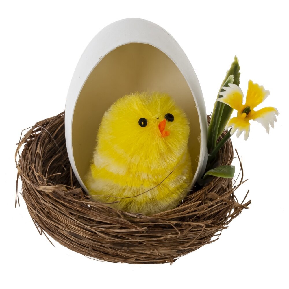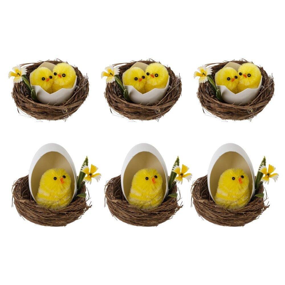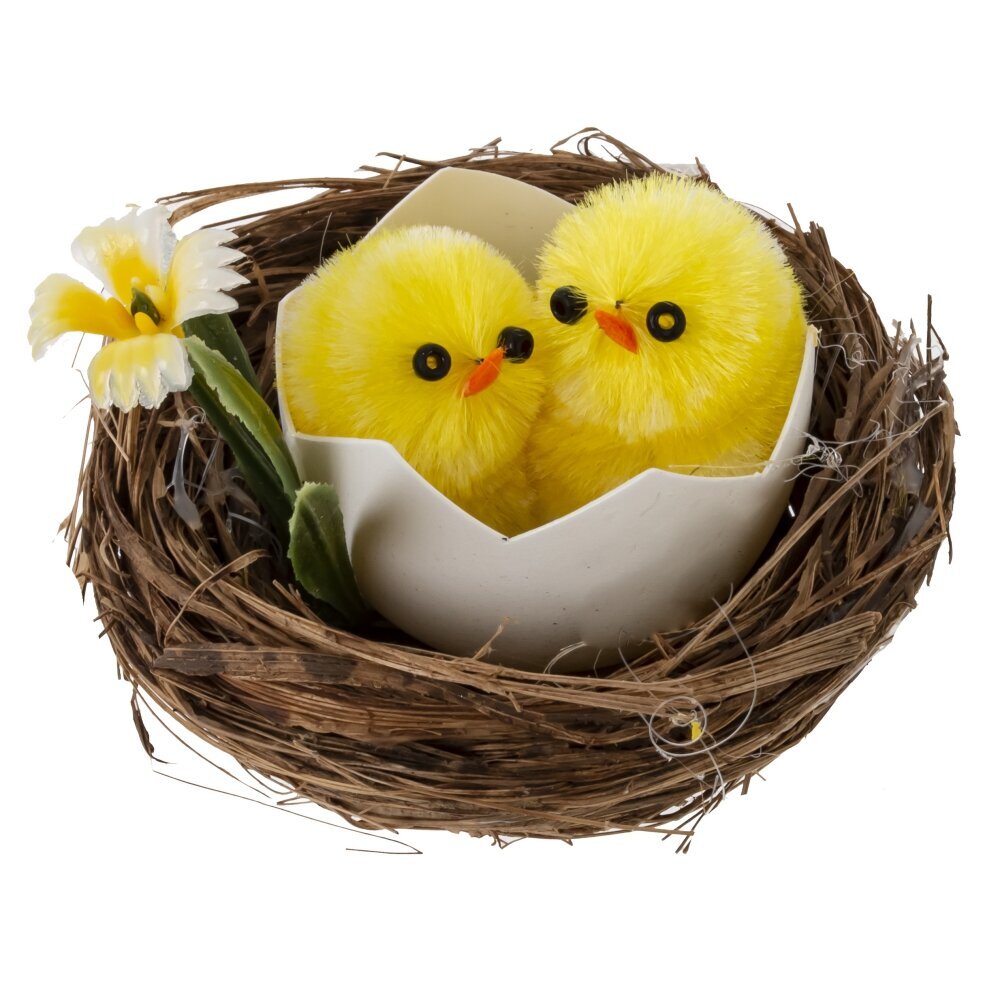 Набор из шести декоративных изделий "Гнездо пасхальное" станет прекрасным украшением для вашего дома в период пасхальных праздников. Изделия выполнены из полимерных, текстильных и натуральных материалов, что придаёт им естественный и уютный вид. Композиция включает в себя миниатюрное птичье гнездо из натурального материала, украшенное искусственными зелёными элементами, а также забавного жёлтого цыплёнка, сидящего внутри декоративного яйца. Этот набор идеально подходит для создания праздничного настроения, оформления интерьера, декорирования праздничного стола или пасхальной корзины. Благодаря использованию натуральных и качественных материалов, композиция выглядит очень реалистично и гармонично вписывается в весенний декор.