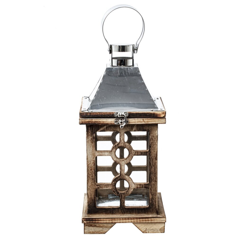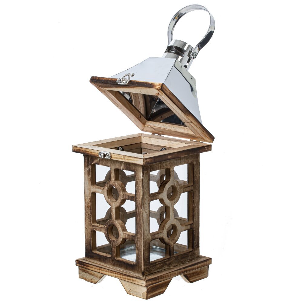 Подсвечник в форме фонаря выполнен в современном стиле. Он украсит ваш дом как внутри, так и снаружи (в саду, на открытых балконах, террасах). Состоит из прозрачных стеклянных стенок и деревянного каркаса. Фонарь можно поставить на основание или повесить на верхнюю петлю. Используйте защелку, чтобы открыть крышку и вставить свечу.